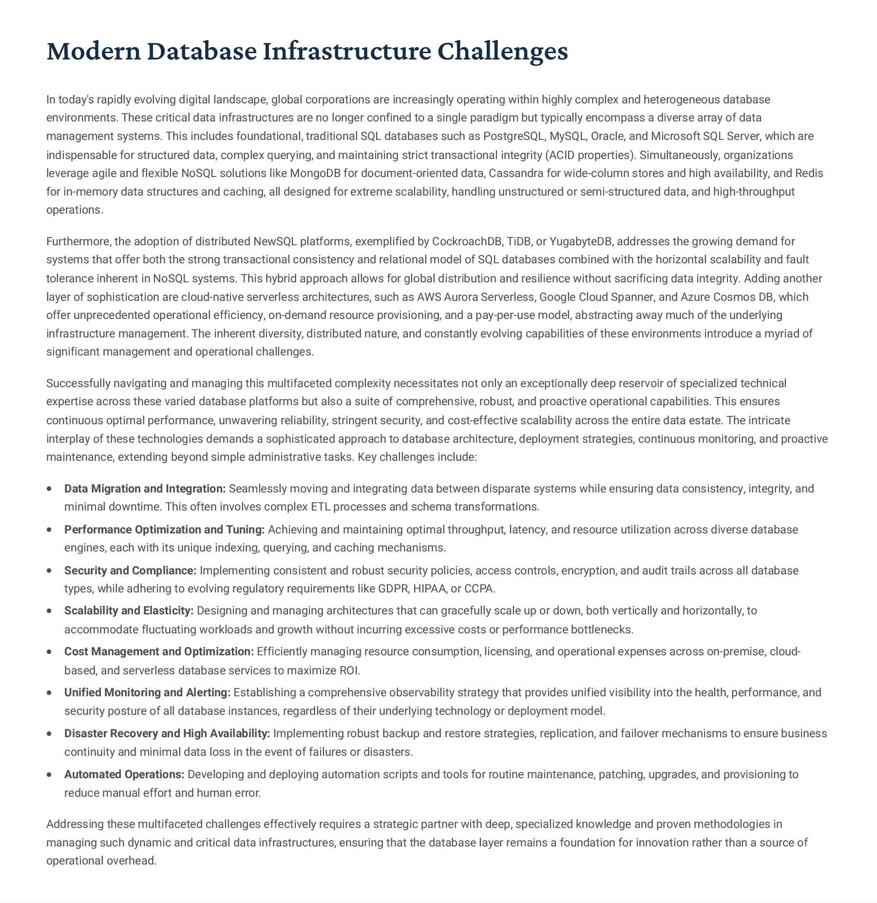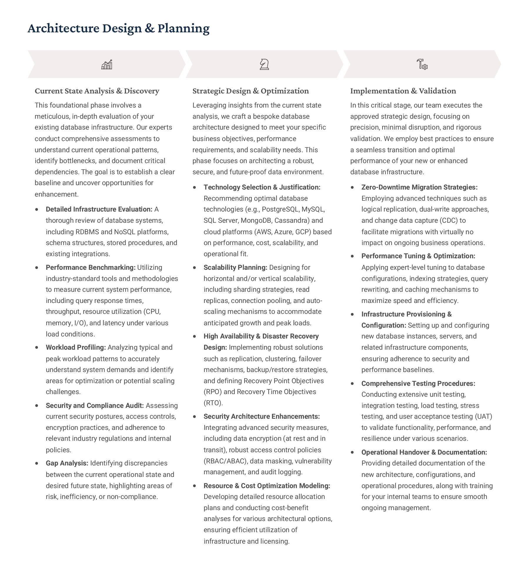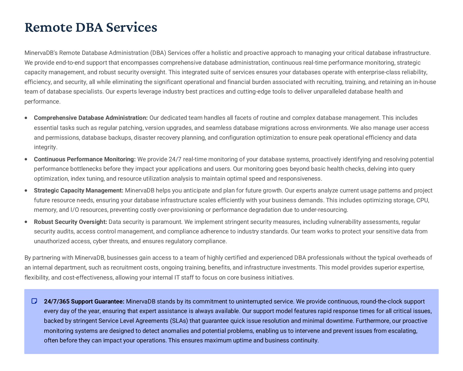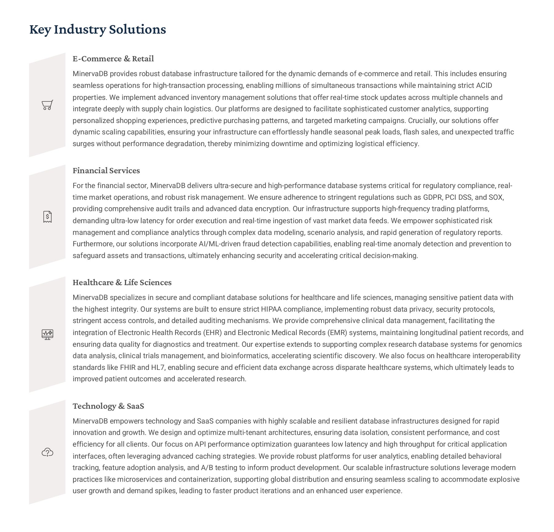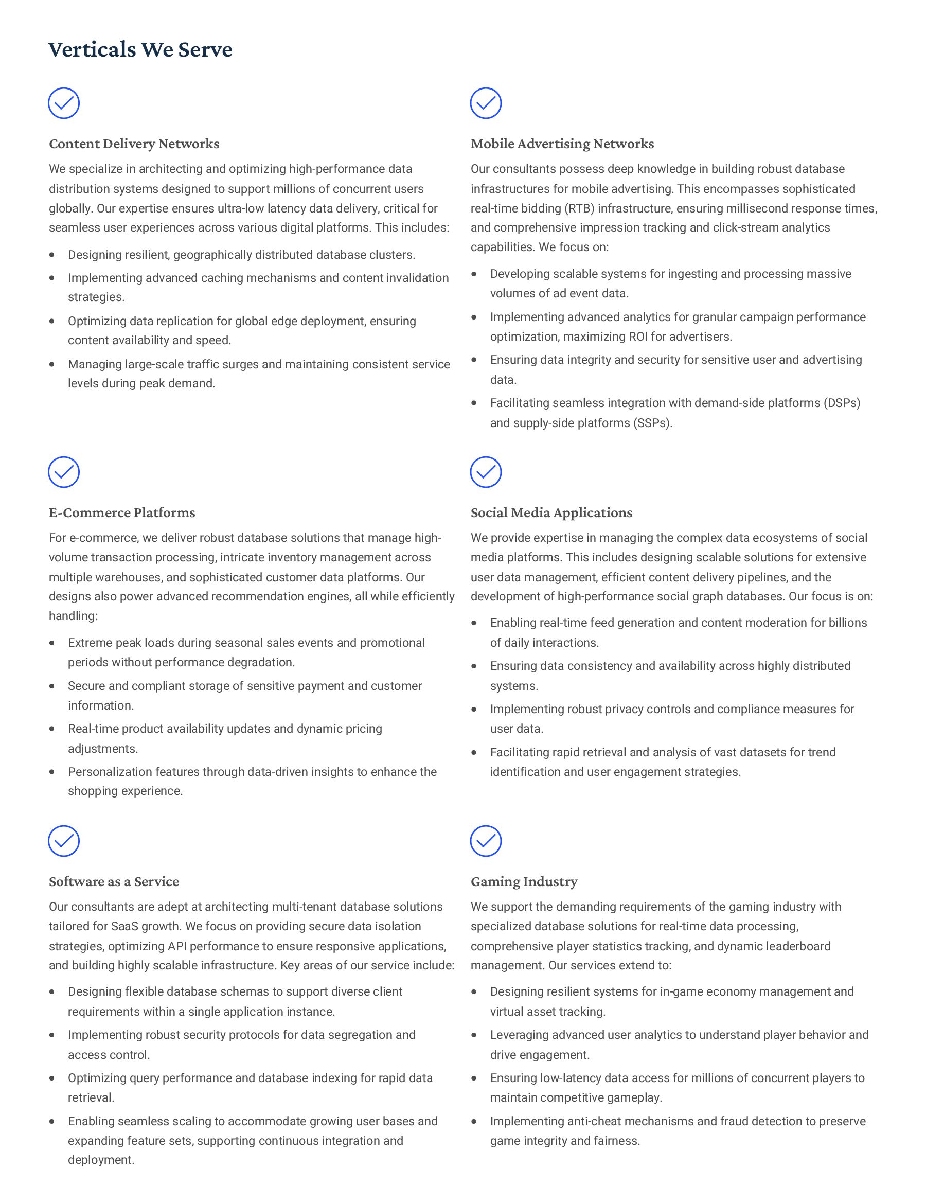 PostgreSQL, focusing on advanced open-source database optimization techniques tailored for mission- critical environments. This includes sophisticated schema design, efficient indexing strategies such as B-tree, GiST, GIN, and BRIN, as well as meticulous query rewriting and performance profiling using tools like EXPLAIN ANALYZE. Our enterprise-grade performance tuning encompasses comprehensive resource allocation management, connection pooling configuration (e.g., PgBouncer), and proactive identification and resolution of bottlenecks to ensure consistent, high- speed data processing. Furthermore, we implement robust high- availability cluster management solutions, leveraging technologies such as Patroni for automated failover, streaming replication for data redundancy, and logical replication for specialized data distribution, guaranteeing continuous operation and disaster recovery capabilities for even the most demanding applications. Our services extend to partitioning strategies (range, list, hash) for managing large datasets, routine maintenance automation, and storage optimization to maximize efficiency and minimize operational costs. MySQL & MariaDB We provide extensive services for MySQL and MariaDB, focusing on maximizing their performance and scalability. Our performance tuning methodologies involve in-depth analysis of query execution plans, optimization of server configuration parameters (e.g., InnoDB buffer pool size, thread concurrency), and effective use of caching mechanisms. For scalability, we design and implement solutions such as read replicas, sharding strategies, and advanced connection management. A core offering is Galera Cluster implementation, providing synchronous multi- master replication for high write availability and near-zero data loss, ensuring strong consistency across nodes. We also specialize in seamless cloud migration services, meticulously planning and executing transitions to platforms like AWS RDS, Azure Database for MySQL, or Google Cloud SQL, minimizing downtime, ensuring data integrity through rigorous validation, and optimizing cloud-specific configurations to leverage native advantages. Our expertise covers both community and enterprise versions, offering bespoke solutions for various use cases, from web applications to complex transactional systems. Oracle MySQL HeatWave MinervaDB delivers specialized optimization services for Oracle MySQL HeatWave, a powerful cloud-native analytics platform designed for demanding transactional and analytical workloads. Our approach focuses on architecting solutions that fully leverage HeatWave's in-memory acceleration capabilities, providing real-time analytics directly on operational data without ETL processes. We configure and fine-tune HeatWave clusters for optimal performance, ensuring rapid data ingestion and vectorized query processing for lightning-fast analytical queries. This includes schema optimization for columnar storage, efficient data loading strategies, and integration with Oracle Cloud Infrastructure (OCI) services for streamlined operations. Our expertise helps clients unlock the full potential of HeatWave for use cases like real-time dashboards, fraud detection, and personalized customer experiences, significantly reducing query latency and enhancing decision-making capabilities. We also provide guidance on cost optimization within the OCI ecosystem, helping businesses achieve a superior price-performance ratio for their data analytics initiatives. Enterprise Features ACID Compliance and Transaction Management: We ensure rigorous adherence to Atomicity, Consistency, Isolation, and Durability (ACID) properties, implementing robust transaction management protocols to safeguard data integrity even under high concurrency. Our solutions involve careful selection of transaction isolation levels and thorough testing to prevent data corruption and ensure reliable data persistence. Advanced Replication Strategies: MinervaDB designs and deploys sophisticated replication topologies including asynchronous, semi- synchronous, and synchronous replication across various distances and network conditions. This encompasses logical replication for selective data synchronization, physical replication for disaster recovery, and geo-replication for multi-region resilience, ensuring data availability and consistency across distributed environments. Query Optimization and Index Tuning: Our experts conduct comprehensive query analysis, identifying inefficient queries and proposing optimizations such as refactoring SQL, utilizing appropriate join types, and creating specialized indexes (e.g., covering indexes, functional indexes). We manage database statistics, analyze execution plans, and leverage advanced profiling tools to continuously enhance query performance. Robust Security Protocols and Access Control: We implement industry-leading security measures, including strong authentication mechanisms, encryption for data at rest and in transit, role-based access control (RBAC), and regular security audits to protect sensitive data from unauthorized access and cyber threats. Comprehensive Backup and Recovery Solutions: MinervaDB develops and manages tailored backup strategies (full, incremental, differential) using proven technologies like pg_basebackup, mysqldump, and Percona XtraBackup. We establish robust recovery procedures, conduct regular recovery drills, and ensure rapid point-in-time recovery capabilities to minimize data loss and operational disruption. Proactive Monitoring and Alerting Systems: We deploy and configure advanced monitoring solutions (e.g., Prometheus, Grafana, PMM) to continuously track database health, performance metrics, and resource utilization. Integrated alerting systems provide real-time notifications for potential issues, enabling proactive intervention and preventing outages.