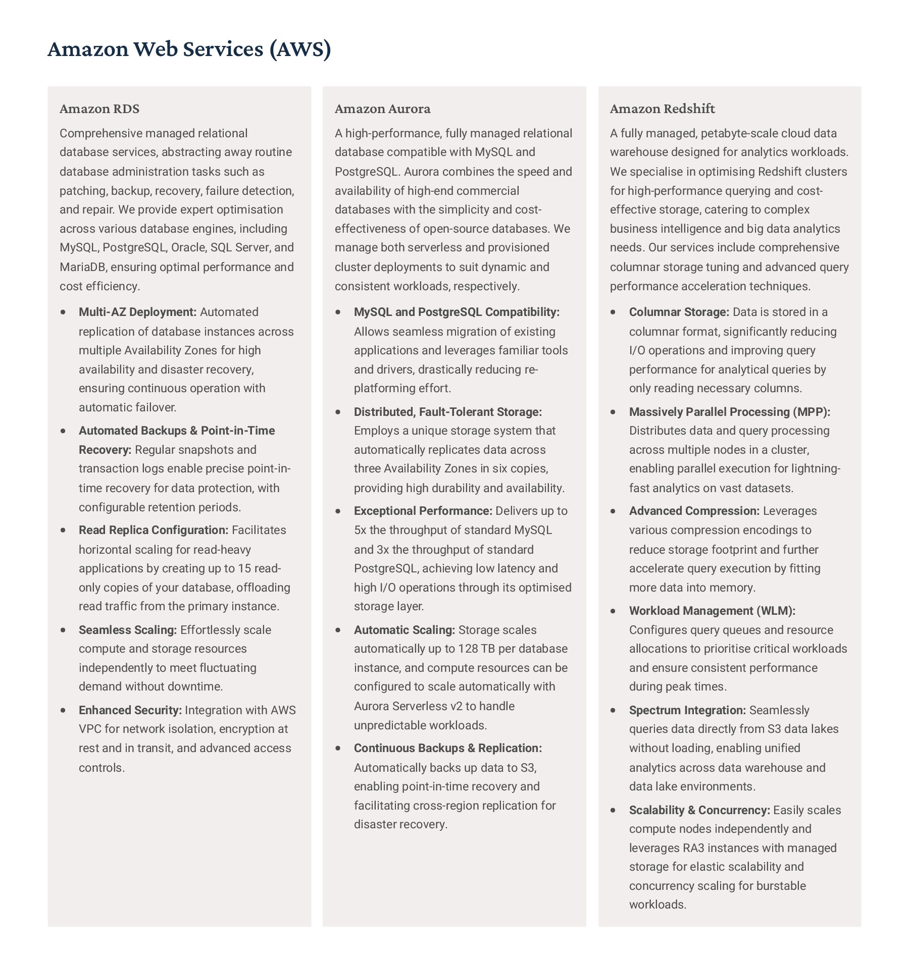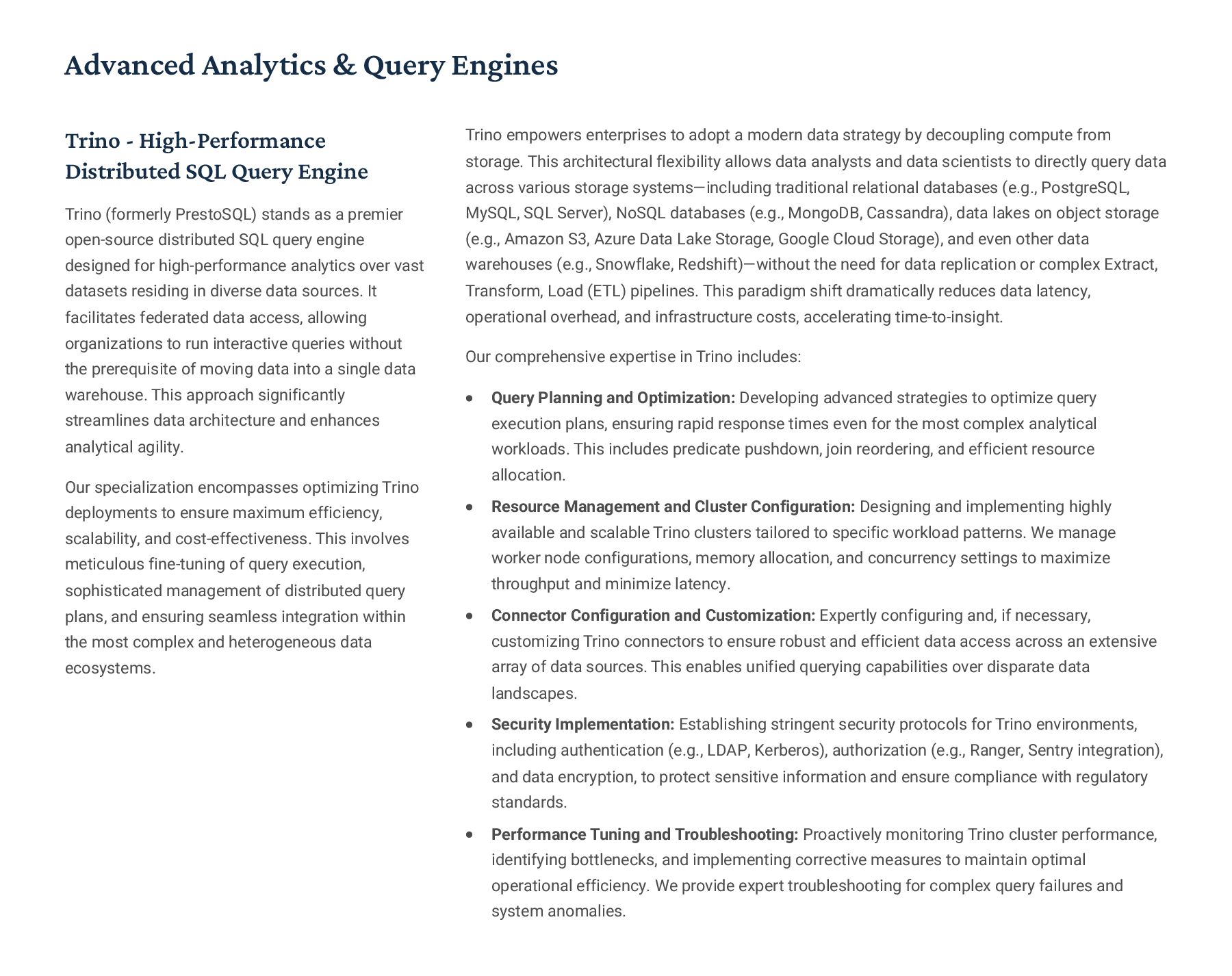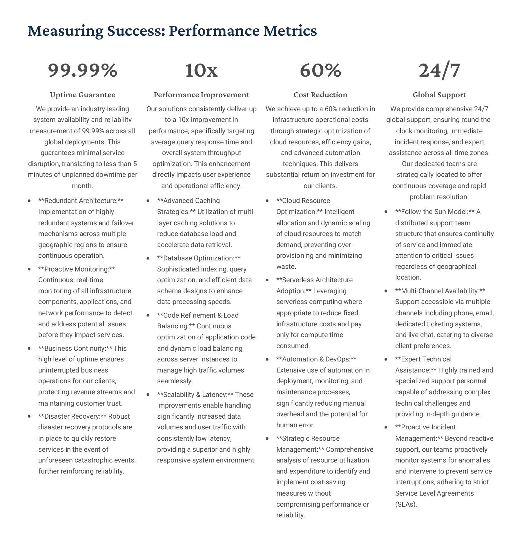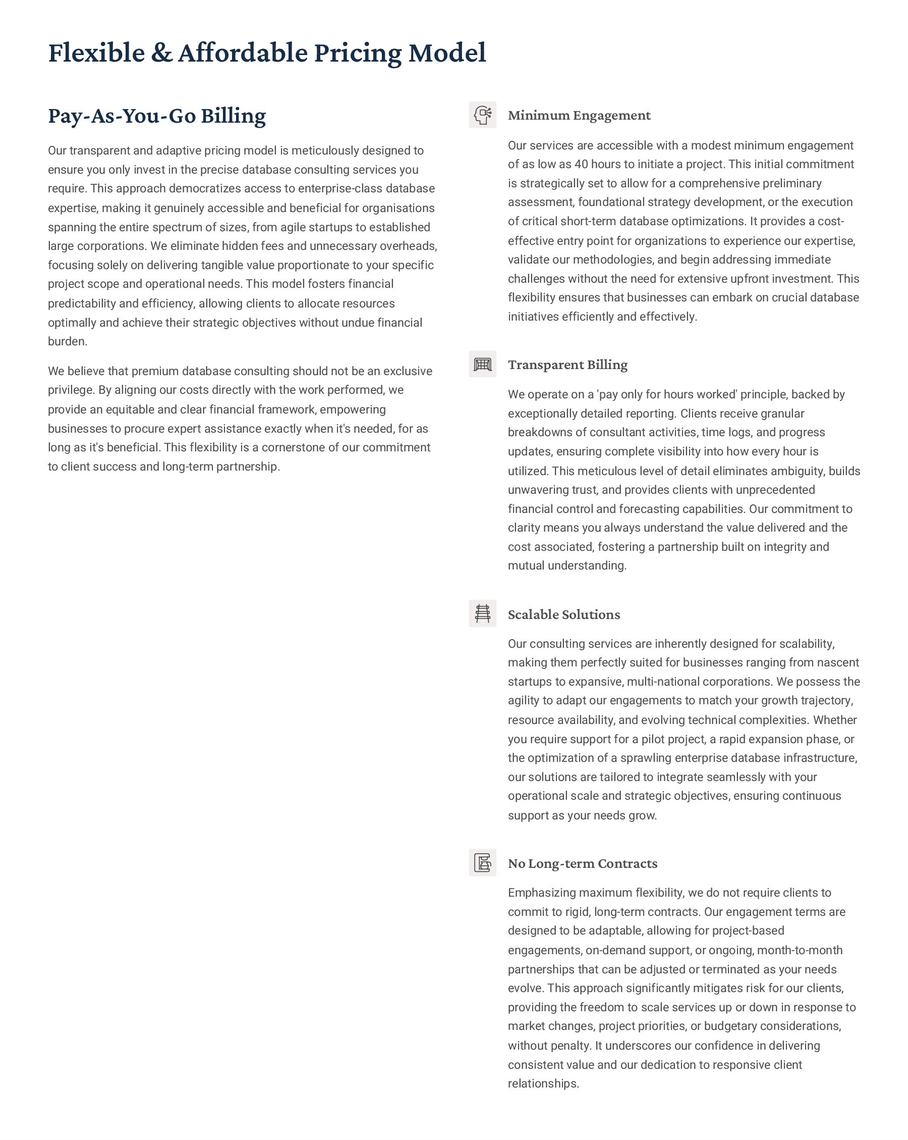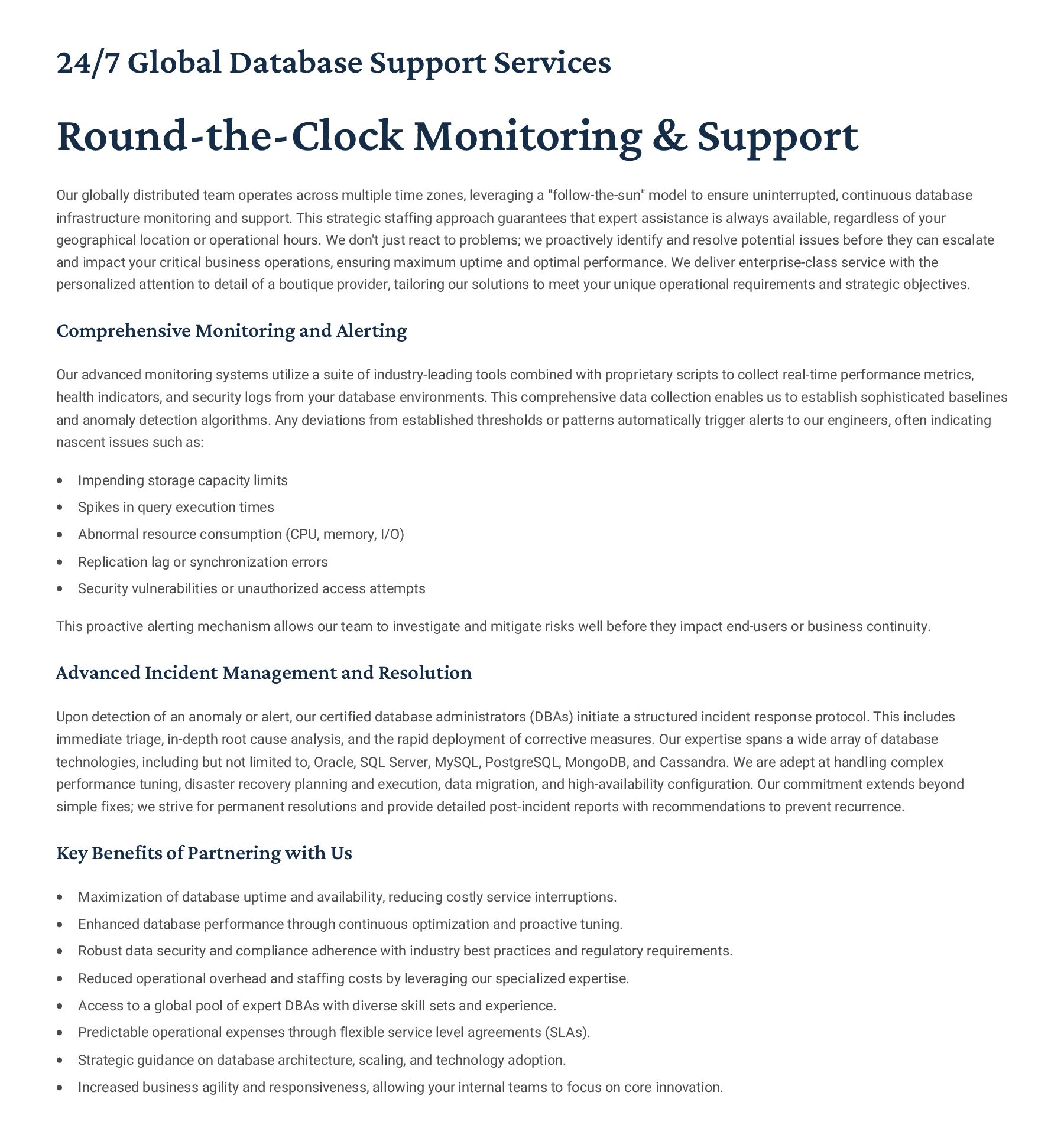 PostgreSQL, focusing on advanced open-source database optimization techniques tailored for mission- critical environments. This includes sophisticated schema design, efficient indexing strategies such as B-tree, GiST, GIN, and BRIN, as well as meticulous query rewriting and performance profiling using tools like EXPLAIN ANALYZE. Our enterprise-grade performance tuning encompasses comprehensive resource allocation management, connection pooling configuration (e.g., PgBouncer), and proactive identification and resolution of bottlenecks to ensure consistent, high- speed data processing. Furthermore, we implement robust high- availability cluster management solutions, leveraging technologies such as Patroni for automated failover, streaming replication for data redundancy, and logical replication for specialized data distribution, guaranteeing continuous operation and disaster recovery capabilities for even the most demanding applications. Our services extend to partitioning strategies (range, list, hash) for managing large datasets, routine maintenance automation, and storage optimization to maximize efficiency and minimize operational costs. MySQL & MariaDB We provide extensive services for MySQL and MariaDB, focusing on maximizing their performance and scalability. Our performance tuning methodologies involve in-depth analysis of query execution plans, optimization of server configuration parameters (e.g., InnoDB buffer pool size, thread concurrency), and effective use of caching mechanisms. For scalability, we design and implement solutions such as read replicas, sharding strategies, and advanced connection management. A core offering is Galera Cluster implementation, providing synchronous multi- master replication for high write availability and near-zero data loss, ensuring strong consistency across nodes. We also specialize in seamless cloud migration services, meticulously planning and executing transitions to platforms like AWS RDS, Azure Database for MySQL, or Google Cloud SQL, minimizing downtime, ensuring data integrity through rigorous validation, and optimizing cloud-specific configurations to leverage native advantages. Our expertise covers both community and enterprise versions, offering bespoke solutions for various use cases, from web applications to complex transactional systems. Oracle MySQL HeatWave MinervaDB delivers specialized optimization services for Oracle MySQL HeatWave, a powerful cloud-native analytics platform designed for demanding transactional and analytical workloads. Our approach focuses on architecting solutions that fully leverage HeatWave's in-memory acceleration capabilities, providing real-time analytics directly on operational data without ETL processes. We configure and fine-tune HeatWave clusters for optimal performance, ensuring rapid data ingestion and vectorized query processing for lightning-fast analytical queries. This includes schema optimization for columnar storage, efficient data loading strategies, and integration with Oracle Cloud Infrastructure (OCI) services for streamlined operations. Our expertise helps clients unlock the full potential of HeatWave for use cases like real-time dashboards, fraud detection, and personalized customer experiences, significantly reducing query latency and enhancing decision-making capabilities. We also provide guidance on cost optimization within the OCI ecosystem, helping businesses achieve a superior price-performance ratio for their data analytics initiatives. Enterprise Features ACID Compliance and Transaction Management: We ensure rigorous adherence to Atomicity, Consistency, Isolation, and Durability (ACID) properties, implementing robust transaction management protocols to safeguard data integrity even under high concurrency. Our solutions involve careful selection of transaction isolation levels and thorough testing to prevent data corruption and ensure reliable data persistence. Advanced Replication Strategies: MinervaDB designs and deploys sophisticated replication topologies including asynchronous, semi- synchronous, and synchronous replication across various distances and network conditions. This encompasses logical replication for selective data synchronization, physical replication for disaster recovery, and geo-replication for multi-region resilience, ensuring data availability and consistency across distributed environments. Query Optimization and Index Tuning: Our experts conduct comprehensive query analysis, identifying inefficient queries and proposing optimizations such as refactoring SQL, utilizing appropriate join types, and creating specialized indexes (e.g., covering indexes, functional indexes). We manage database statistics, analyze execution plans, and leverage advanced profiling tools to continuously enhance query performance. Robust Security Protocols and Access Control: We implement industry-leading security measures, including strong authentication mechanisms, encryption for data at rest and in transit, role-based access control (RBAC), and regular security audits to protect sensitive data from unauthorized access and cyber threats. Comprehensive Backup and Recovery Solutions: MinervaDB develops and manages tailored backup strategies (full, incremental, differential) using proven technologies like pg_basebackup, mysqldump, and Percona XtraBackup. We establish robust recovery procedures, conduct regular recovery drills, and ensure rapid point-in-time recovery capabilities to minimize data loss and operational disruption. Proactive Monitoring and Alerting Systems: We deploy and configure advanced monitoring solutions (e.g., Prometheus, Grafana, PMM) to continuously track database health, performance metrics, and resource utilization. Integrated alerting systems provide real-time notifications for potential issues, enabling proactive intervention and preventing outages.