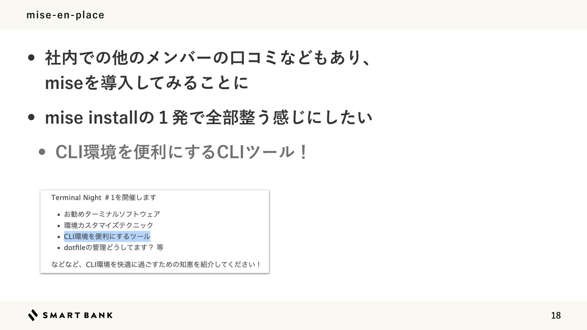 NJTFFOQMBDF w ࣾͰͷଞͷϝϯόʔͷޱίϛͳͲ͋Γɺ NJTFΛಋೖͯ͠ΈΔ͜ͱʹ w NJTFJOTUBMMͷ̍ൃͰશ෦͏ײ͡ʹ͍ͨ͠ w $-*ڥΛศརʹ͢Δ$-*πʔϧʂ