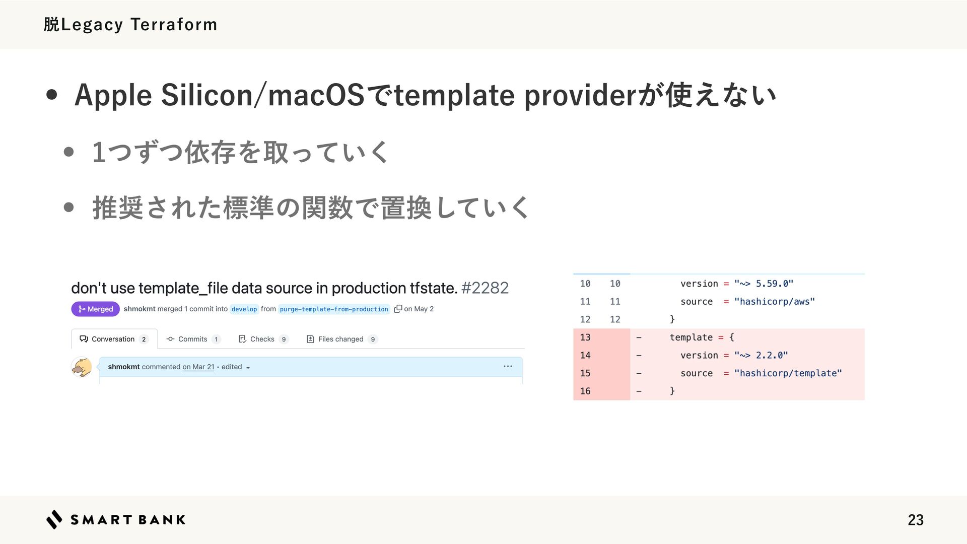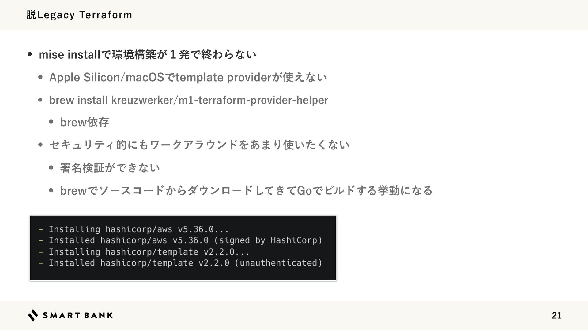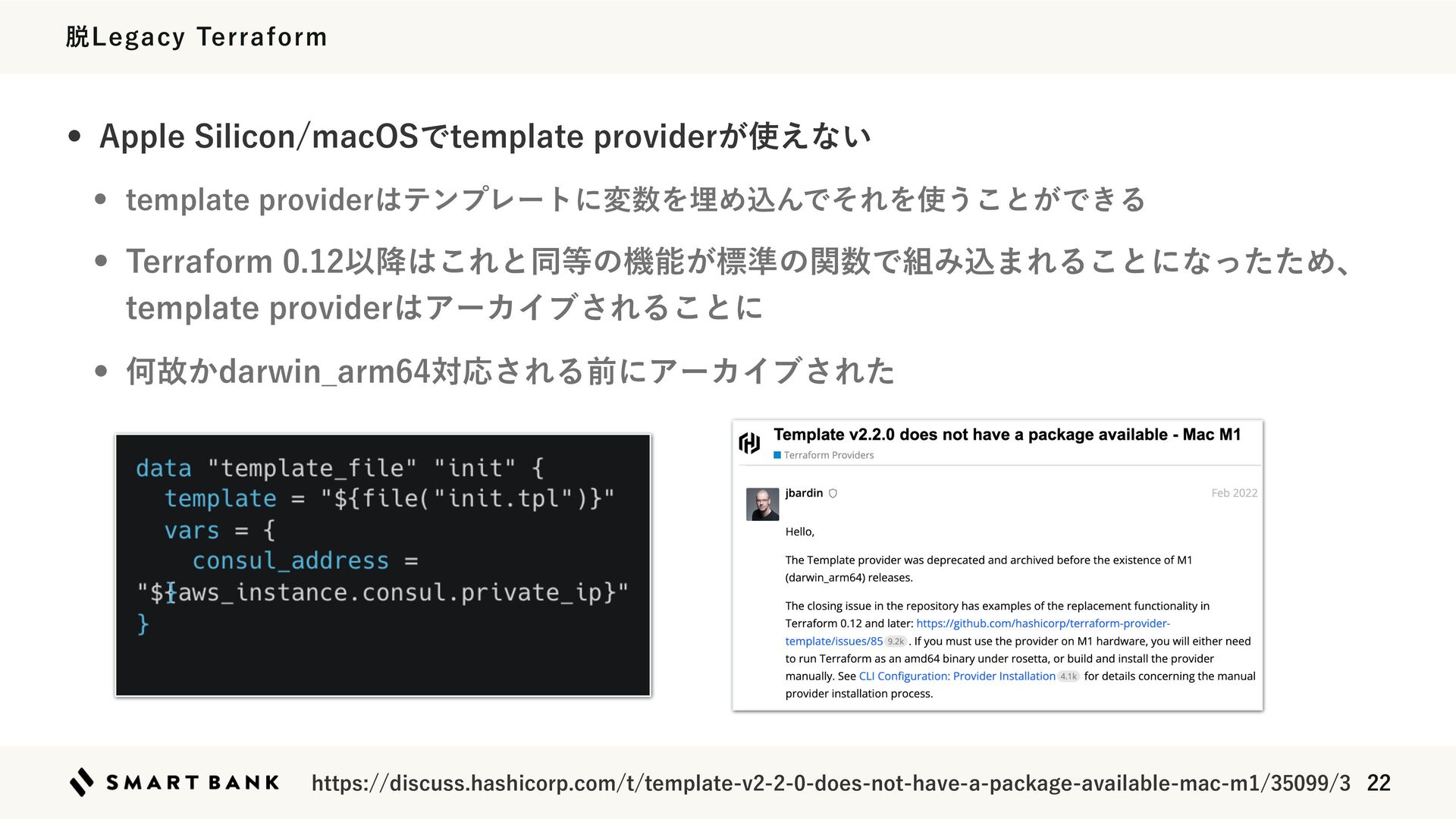 -FHBDZ5FSSBGPSN IUUQTEJTDVTTIBTIJDPSQDPNUUFNQMBUFWEPFTOPUIBWFBQBDLBHFBWBJMBCMFNBDN w "QQMF4JMJDPONBD04ͰUFNQMBUFQSPWJEFS͕͑ͳ͍ w UFNQMBUFQSPWJEFSςϯϓϨʔτʹมΛຒΊࠐΜͰͦΕΛ͏͜ͱ͕Ͱ͖Δ w 5FSSBGPSNҎ߱͜Εͱಉͷػೳ͕ඪ४ͷؔͰΈࠐ·ΕΔ͜ͱʹͳͬͨͨΊɺ UFNQMBUFQSPWJEFSΞʔΧΠϒ͞ΕΔ͜ͱʹ