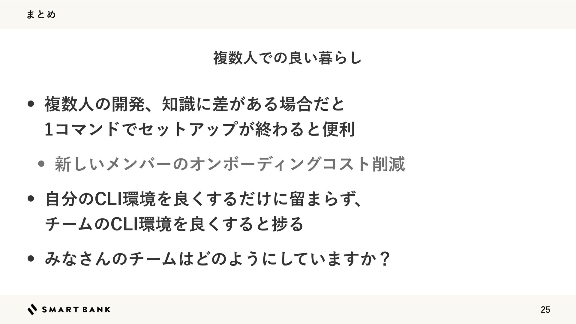 ·ͱΊ w ෳਓͷ։ൃɺࣝʹ͕ࠩ͋Δ߹ͩͱ ίϚϯυͰηοτΞοϓ͕ऴΘΔͱศར w ৽͍͠ϝϯόʔͷΦϯϘʔσΟϯάίετݮ w ࣗͷ$-*ڥΛྑ͘͢Δ͚ͩʹཹ·Βͣɺ νʔϜͷ$-*ڥΛྑ͘͢ΔͱḿΔ