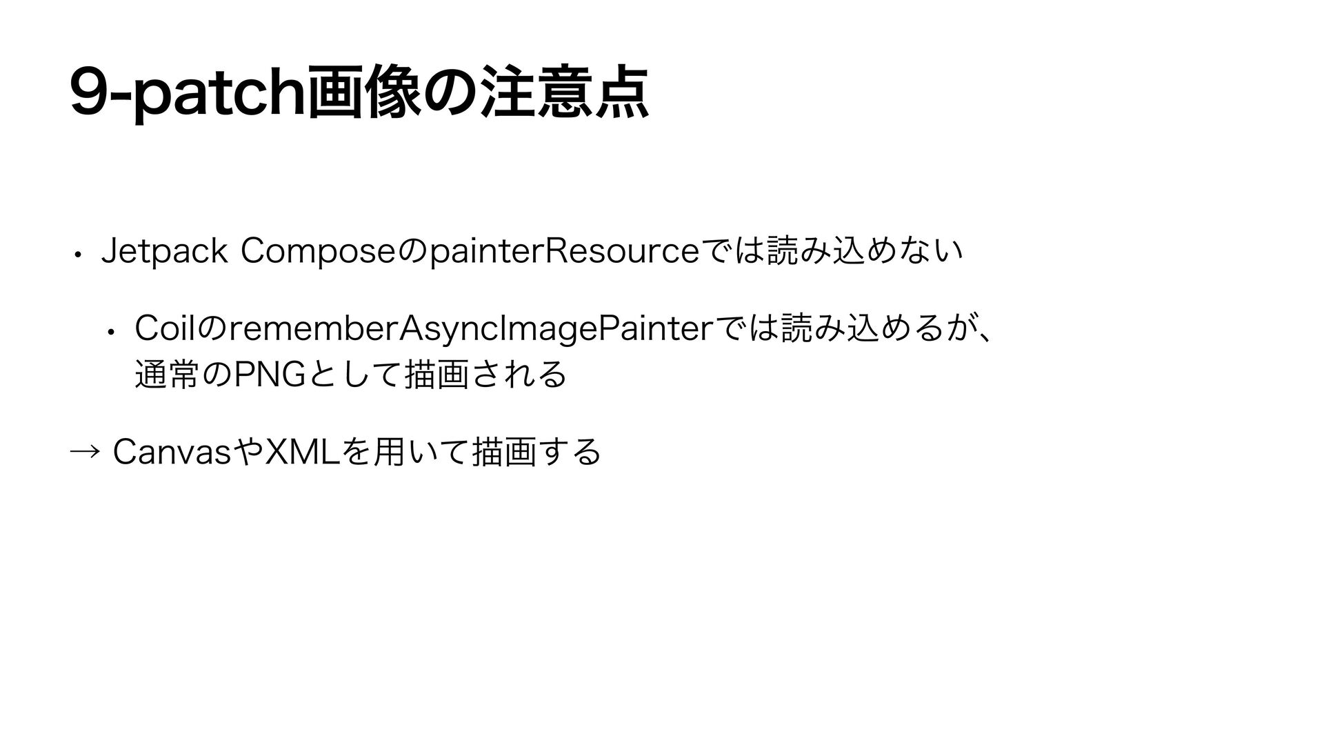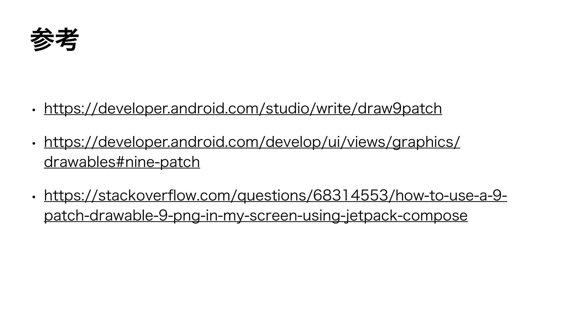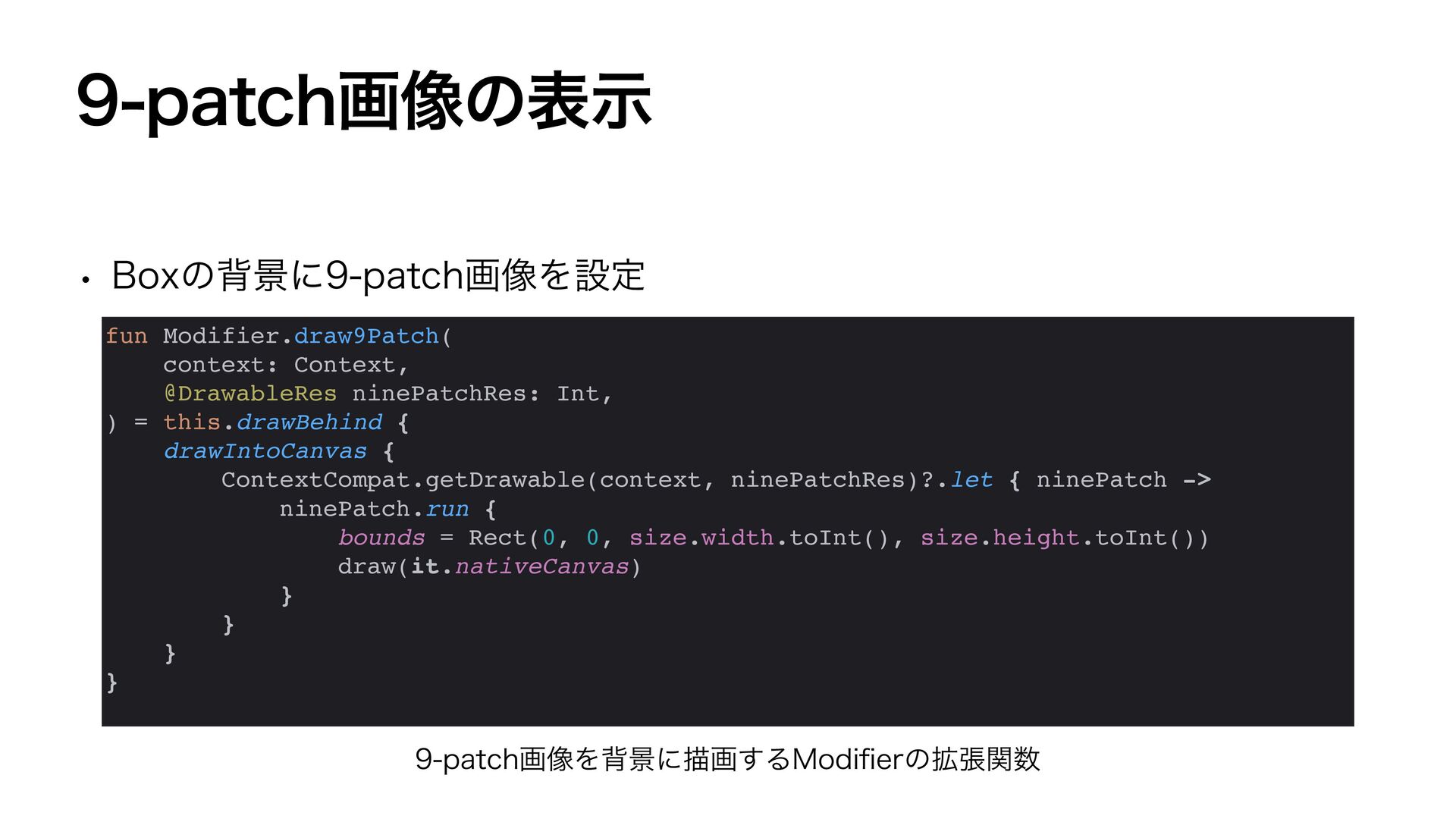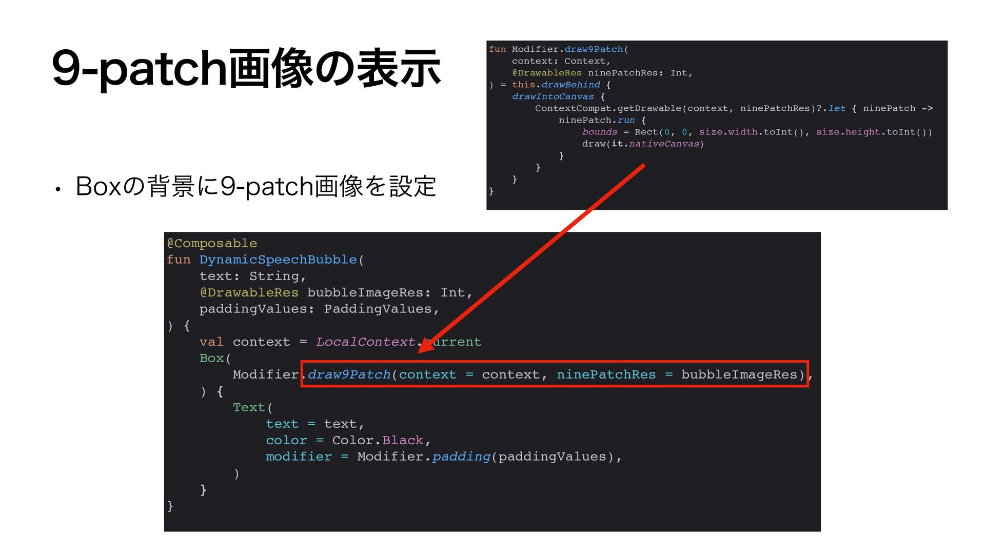 ) = this.drawBehind { drawIntoCanvas { ContextCompat.getDrawable(context, ninePatchRes)?.let { ninePatch -> ninePatch.run { bounds = Rect(0, 0, size.width.toInt(), size.height.toInt()) draw(it.nativeCanvas) } } } } @Composable fun DynamicSpeechBubble( text: String, @DrawableRes bubbleImageRes: Int, paddingValues: PaddingValues, ) { val context = LocalContext.current Box( Modifier.draw9Patch(context = context, ninePatchRes = bubbleImageRes), ) { Text( text = text, color = Color.Black, modifier = Modifier.padding(paddingValues), ) } }