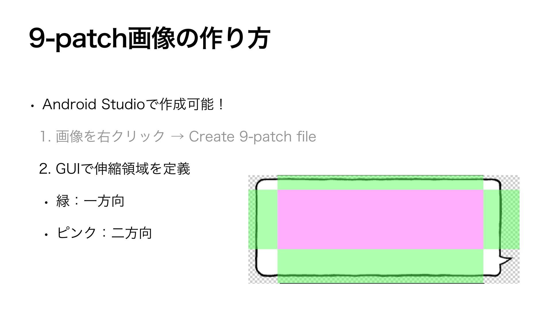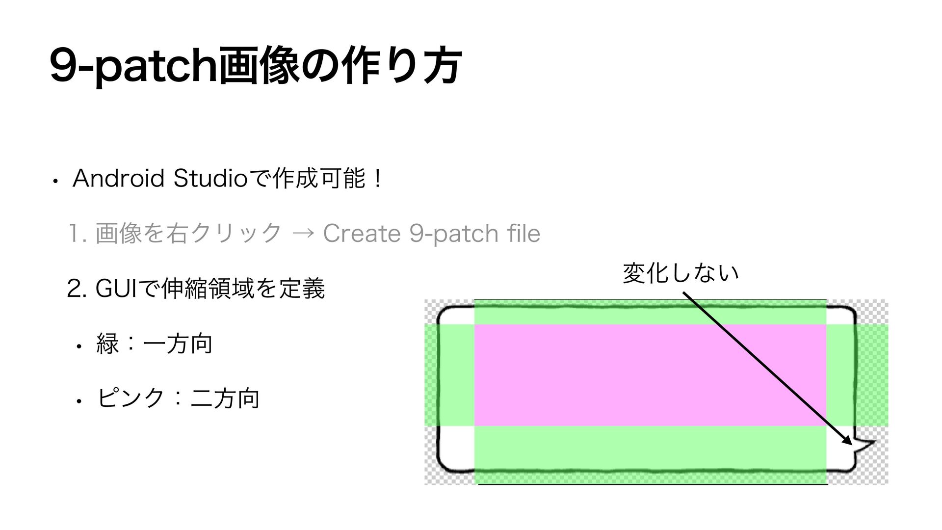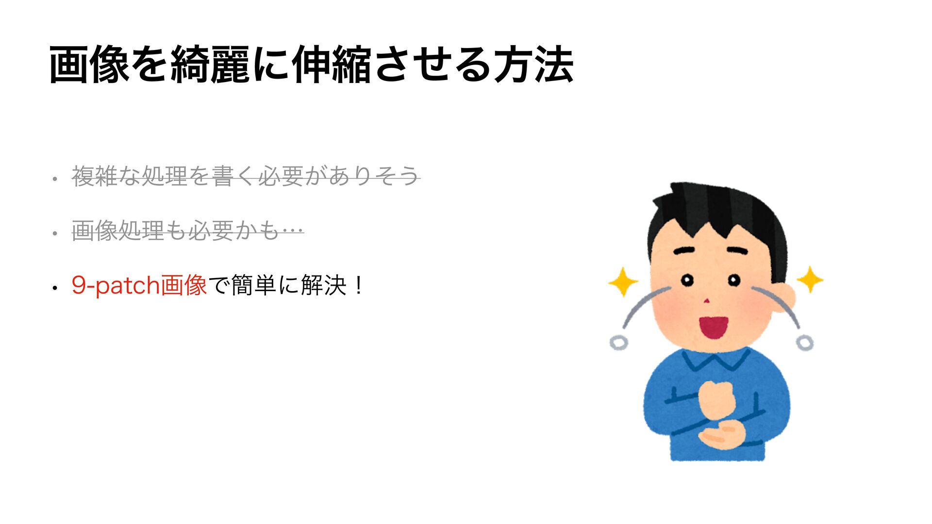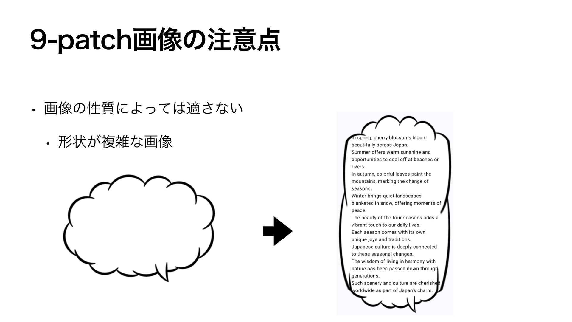 ) = this.drawBehind { drawIntoCanvas { ContextCompat.getDrawable(context, ninePatchRes)?.let { ninePatch -> ninePatch.run { bounds = Rect(0, 0, size.width.toInt(), size.height.toInt()) draw(it.nativeCanvas) } } } } @Composable fun DynamicSpeechBubble( text: String, @DrawableRes bubbleImageRes: Int, paddingValues: PaddingValues, ) { val context = LocalContext.current Box( Modifier.draw9Patch(context = context, ninePatchRes = bubbleImageRes), ) { Text( text = text, color = Color.Black, modifier = Modifier.padding(paddingValues), ) } }