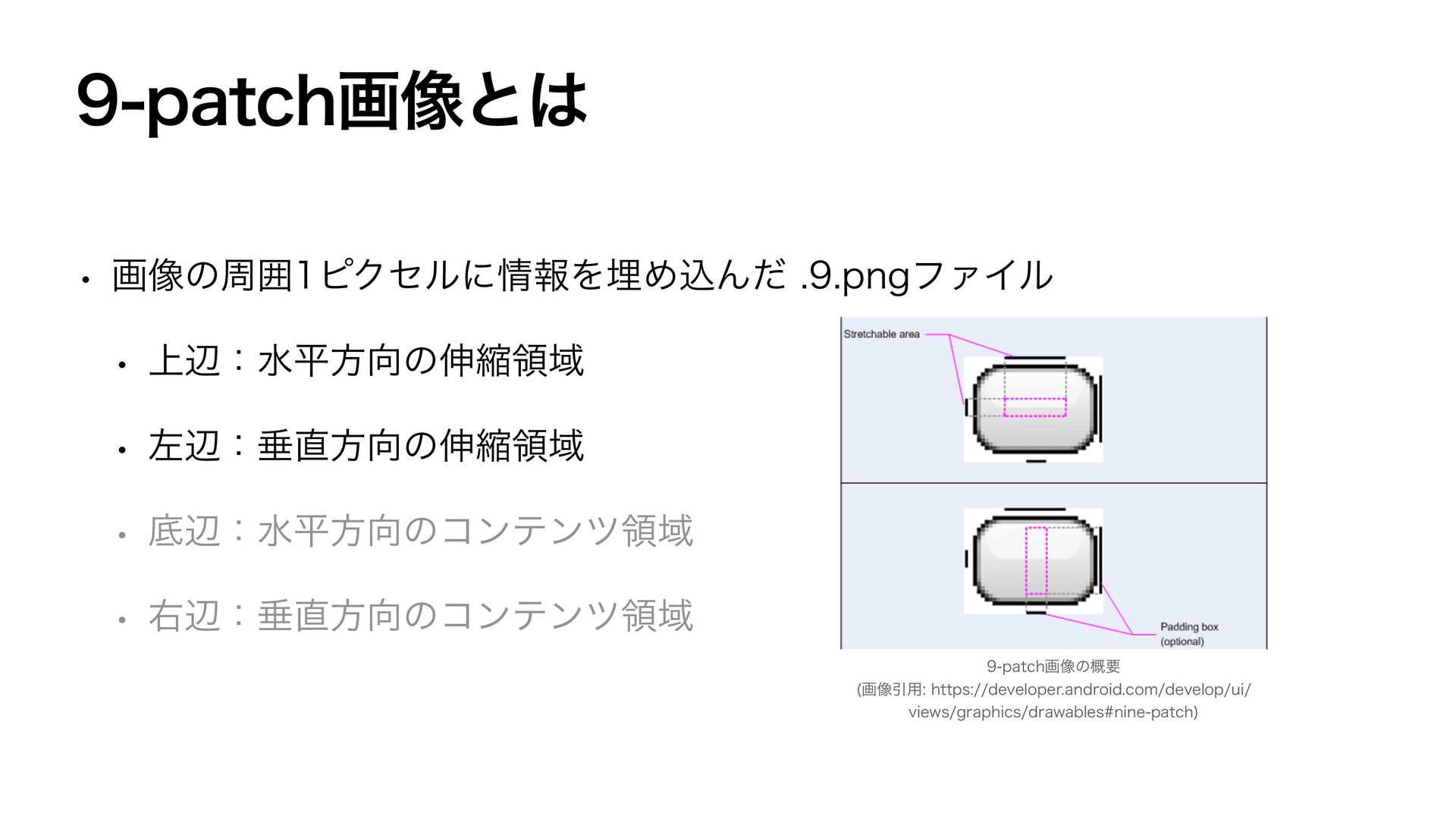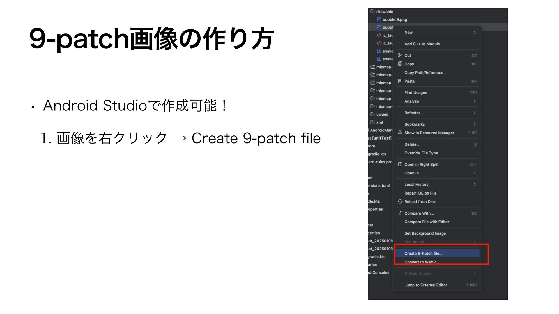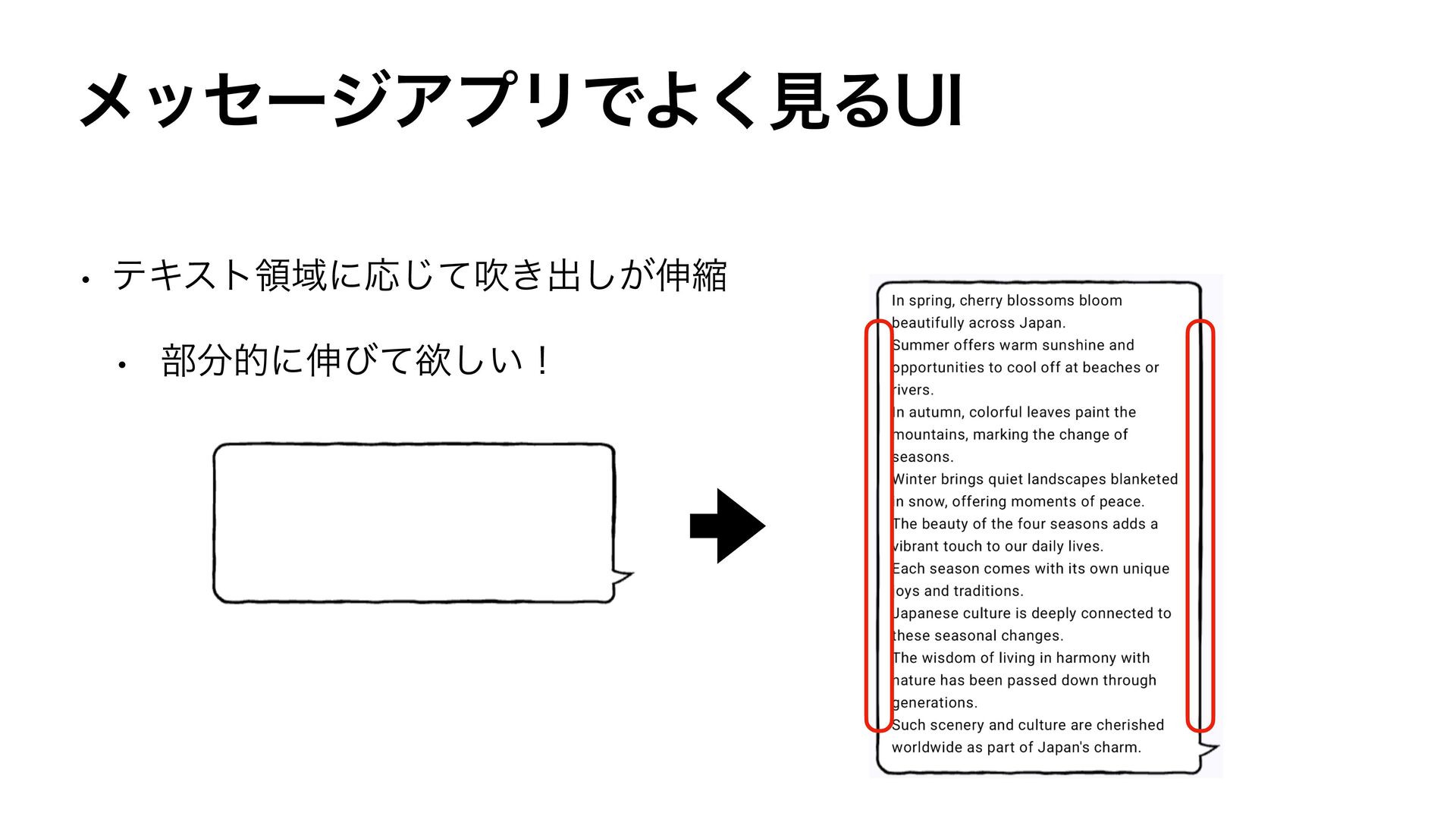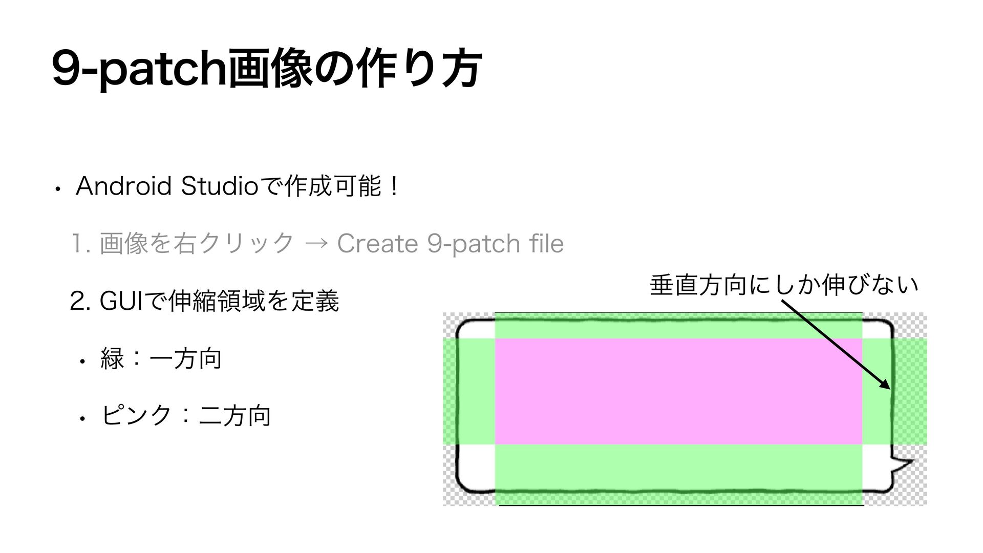 ) = this.drawBehind { drawIntoCanvas { ContextCompat.getDrawable(context, ninePatchRes)?.let { ninePatch -> ninePatch.run { bounds = Rect(0, 0, size.width.toInt(), size.height.toInt()) draw(it.nativeCanvas) } } } } @Composable fun DynamicSpeechBubble( text: String, @DrawableRes bubbleImageRes: Int, paddingValues: PaddingValues, ) { val context = LocalContext.current Box( Modifier.draw9Patch(context = context, ninePatchRes = bubbleImageRes), ) { Text( text = text, color = Color.Black, modifier = Modifier.padding(paddingValues), ) } }