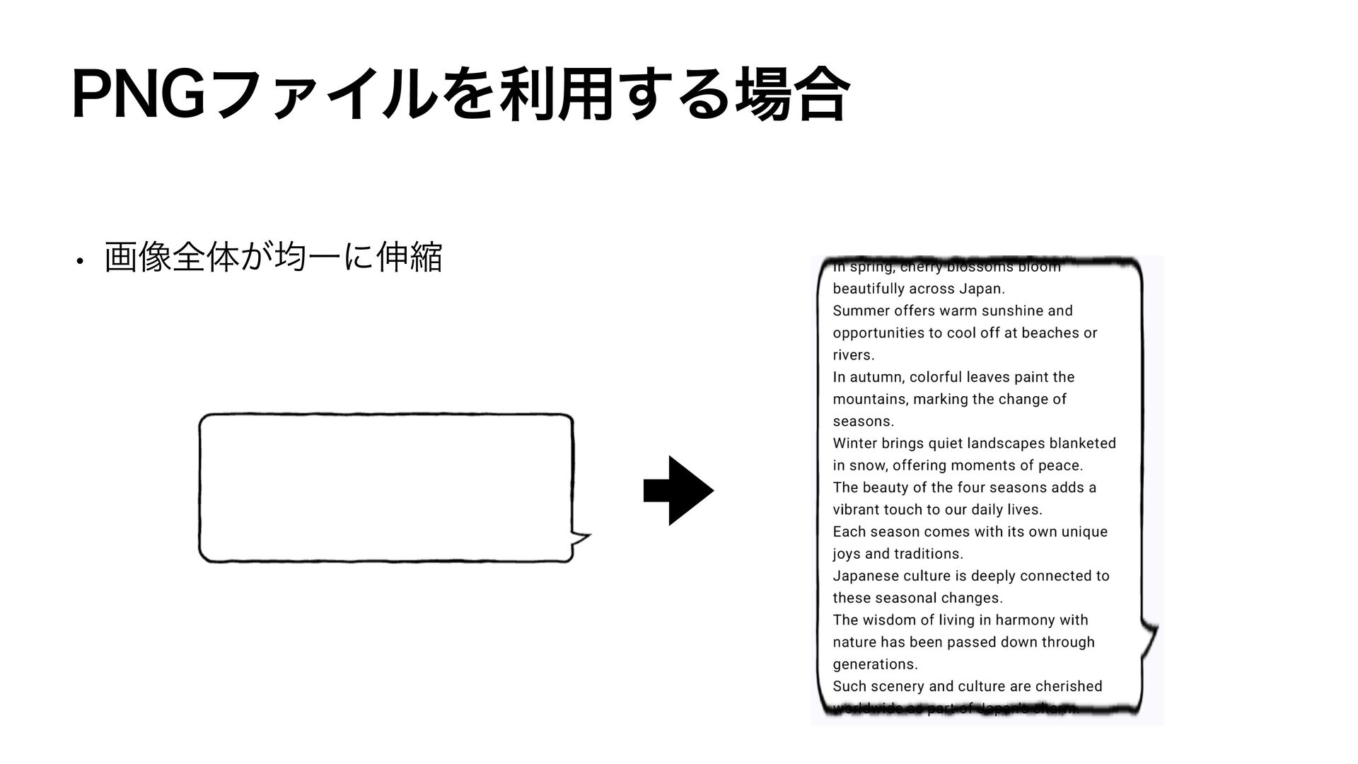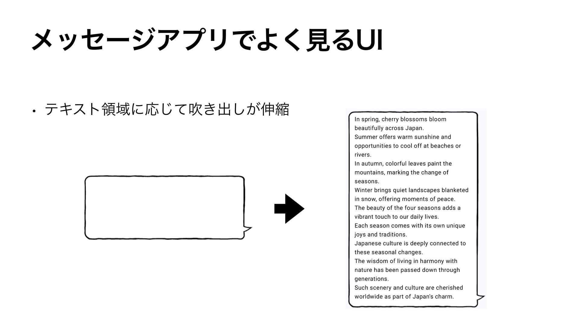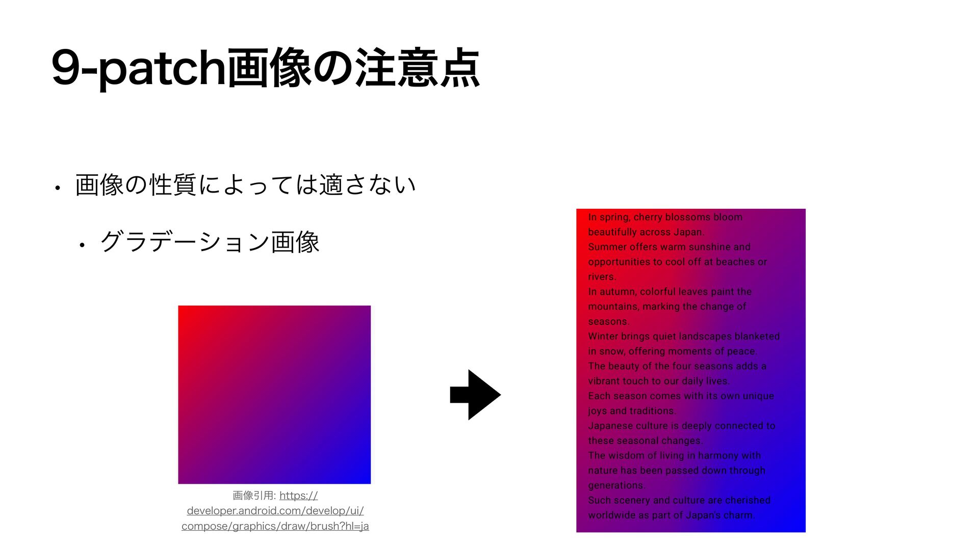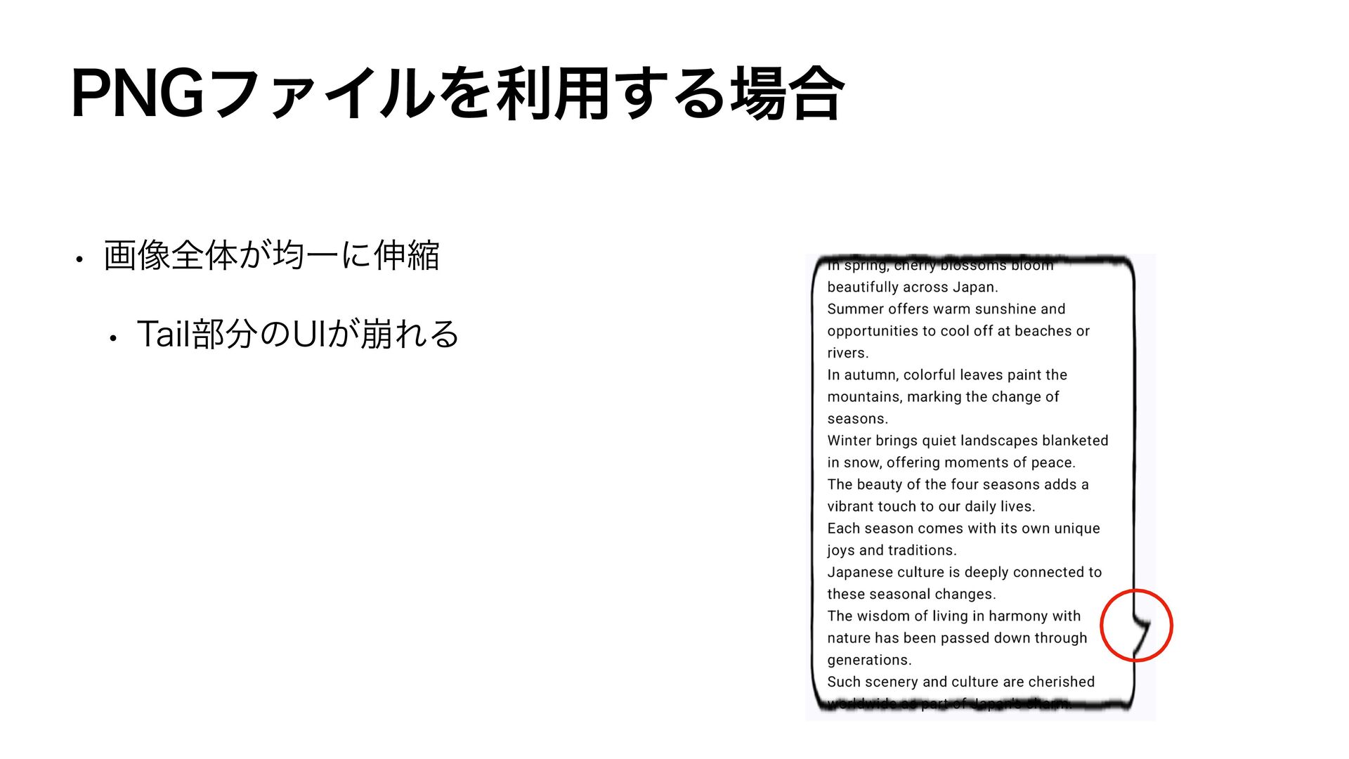 ) = this.drawBehind { drawIntoCanvas { ContextCompat.getDrawable(context, ninePatchRes)?.let { ninePatch -> ninePatch.run { bounds = Rect(0, 0, size.width.toInt(), size.height.toInt()) draw(it.nativeCanvas) } } } } @Composable fun DynamicSpeechBubble( text: String, @DrawableRes bubbleImageRes: Int, paddingValues: PaddingValues, ) { val context = LocalContext.current Box( Modifier.draw9Patch(context = context, ninePatchRes = bubbleImageRes), ) { Text( text = text, color = Color.Black, modifier = Modifier.padding(paddingValues), ) } }
