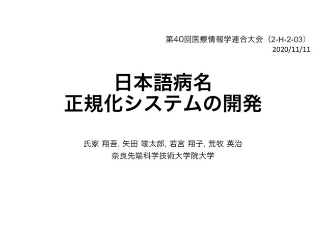 ࣙॻʹΑΔප໊ਖ਼نԽͷݶք • ʮߴ݂ѹʯʹछͷग़ݱܗ͕ଘࡏʢສපࣙॻ˞ΑΓʣ • ༰қʹѻ͑Δຊޠප໊ਖ਼نԽπʔϧͷෆ 2 諸論(2/3) Kaoru Ito, Hiroyuki Nagai, Taro Okahisa, Shoko Wakamiya, Tomohide Iwao, Eiji Aramaki: J-MeDic: A Japanese Disease Name Dictionary based on Real Clinical Usage
