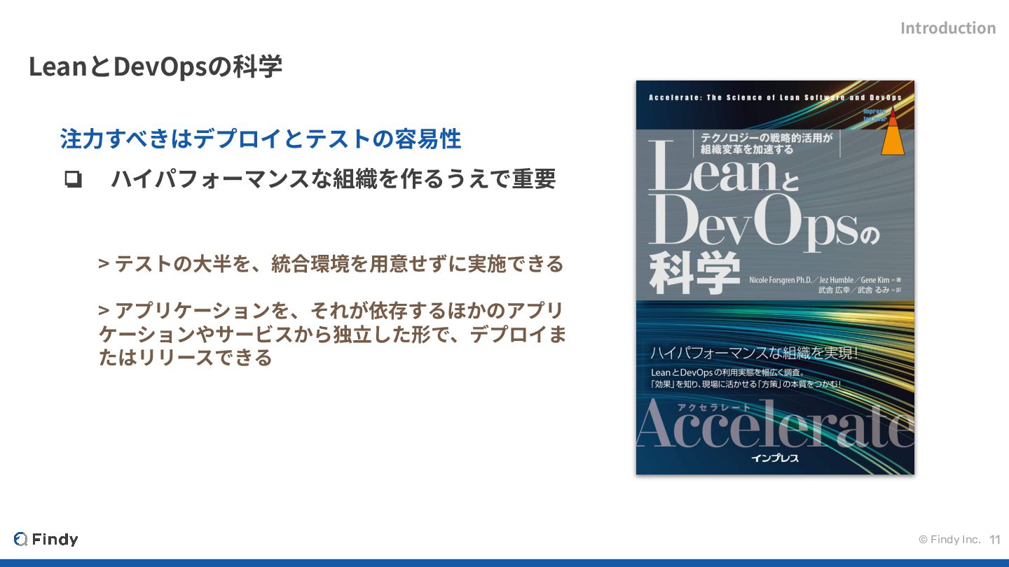 © Findy Inc. 11 Introduction LeanとDevOpsの科学 注⼒すべきはデプロイとテストの容易性 ❏ ハイパフォーマンスな組織を作るうえで重要 >