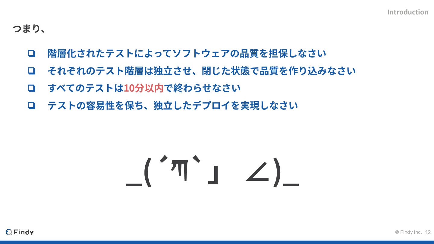 © Findy Inc. 12 Introduction つまり、 ❏ 階層化されたテストによってソフトウェアの品質を担保しなさい ❏ それぞれのテスト階層は独⽴させ、閉じた状態で品質を作り込みなさい