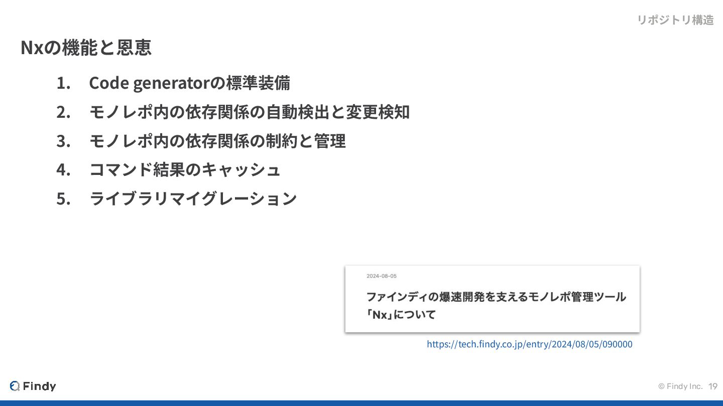 3. モノレポ内の依存関係の制約と管理 4. コマンド結果のキャッシュ 5. ライブラリマイグレーション リポジトリ構造 https://tech.findy.co.jp/entry/2024/08/05/090000