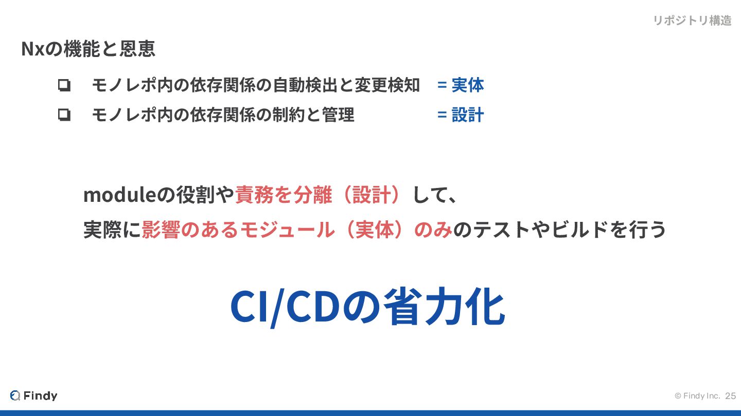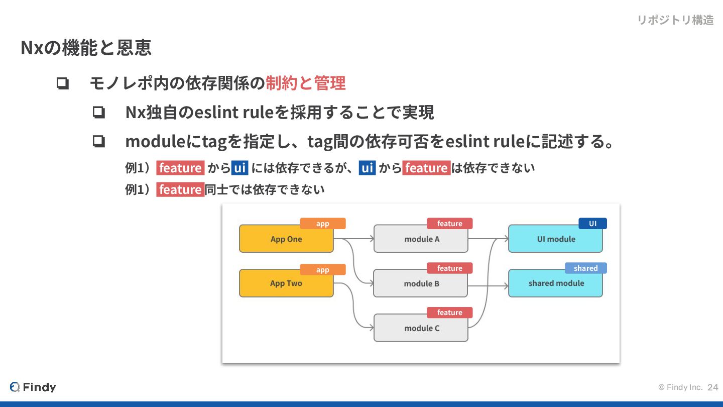 © Findy Inc. 24 Nxの機能と恩恵 リポジトリ構造 ❏ モノレポ内の依存関係の制約と管理 ❏ Nx独⾃のeslint