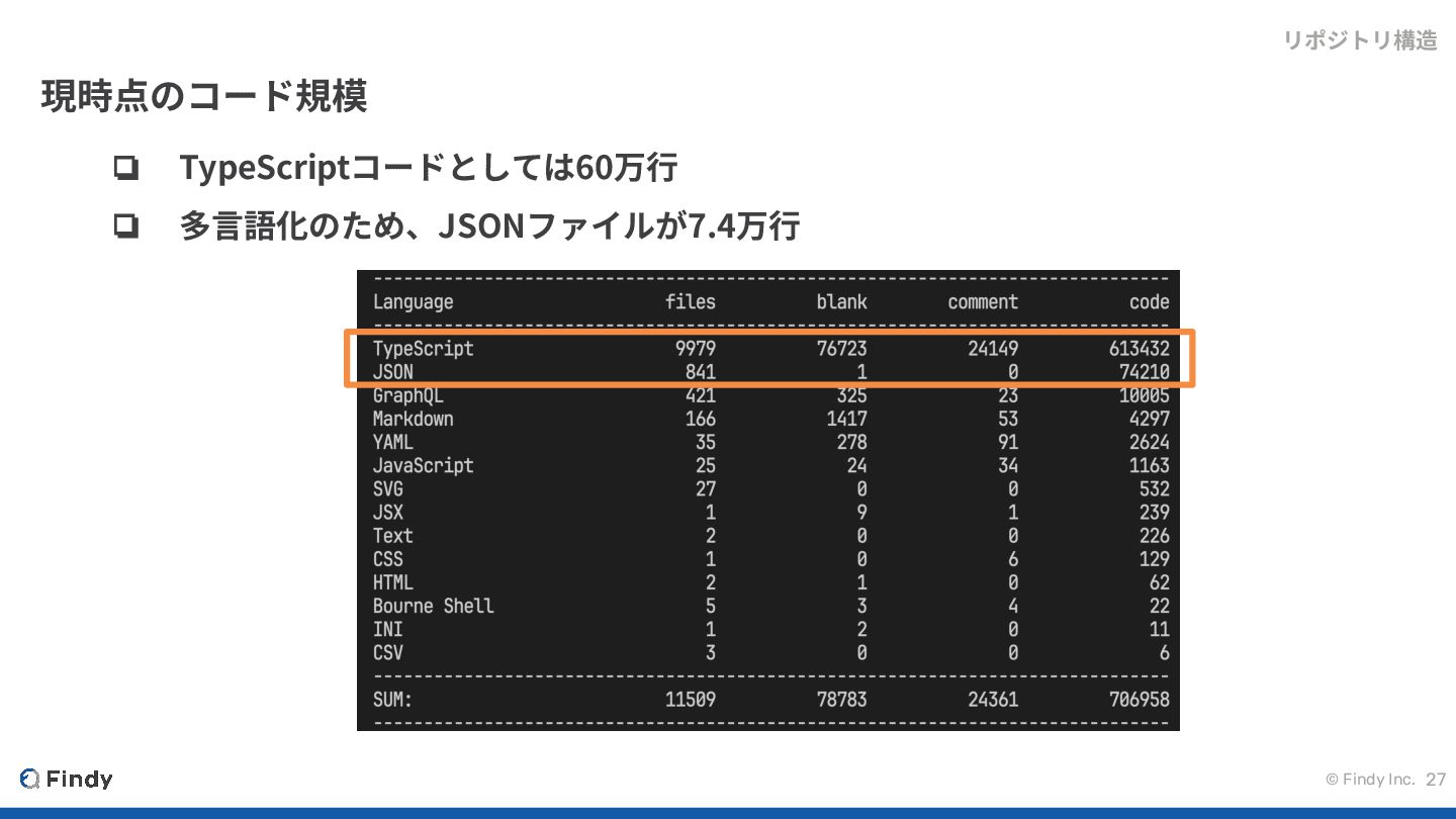 © Findy Inc. ❏ TypeScriptコードとしては60万⾏ ❏ 多⾔語化のため、JSONファイルが7.4万⾏ 27 現時点のコード規模 リポジトリ構造