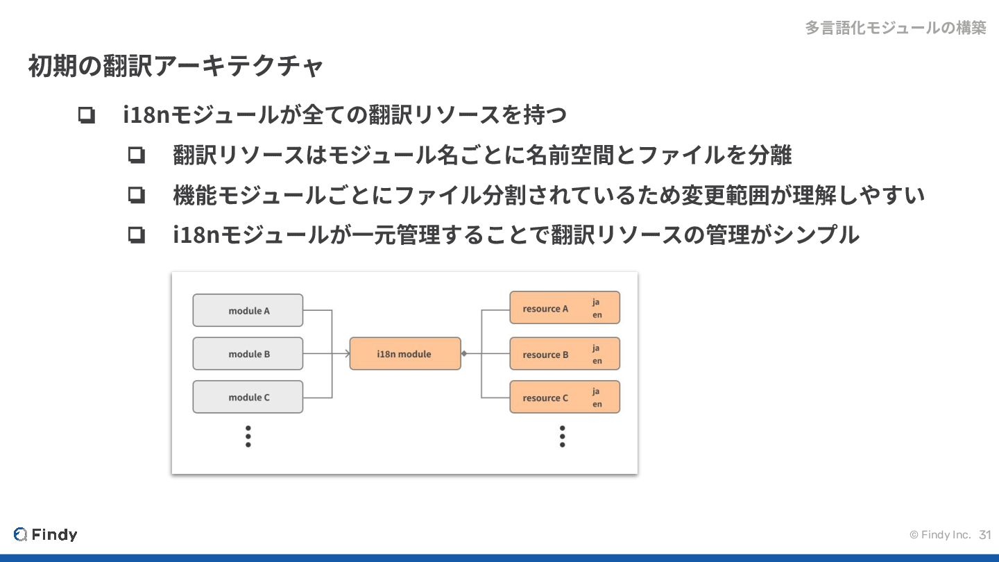 © Findy Inc. 31 初期の翻訳アーキテクチャ 多⾔語化モジュールの構築 ❏ i18nモジュールが全ての翻訳リソースを持つ ❏ 翻訳リソースはモジュール名ごとに名前空間とファイルを分離