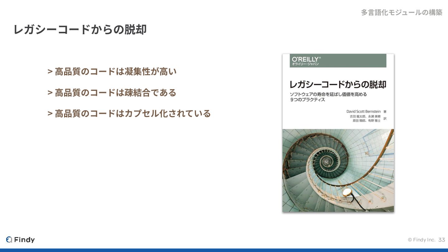 © Findy Inc. 33 多⾔語化モジュールの構築 レガシーコードからの脱却 > ⾼品質のコードは凝集性が⾼い > ⾼品質のコードは疎結合である