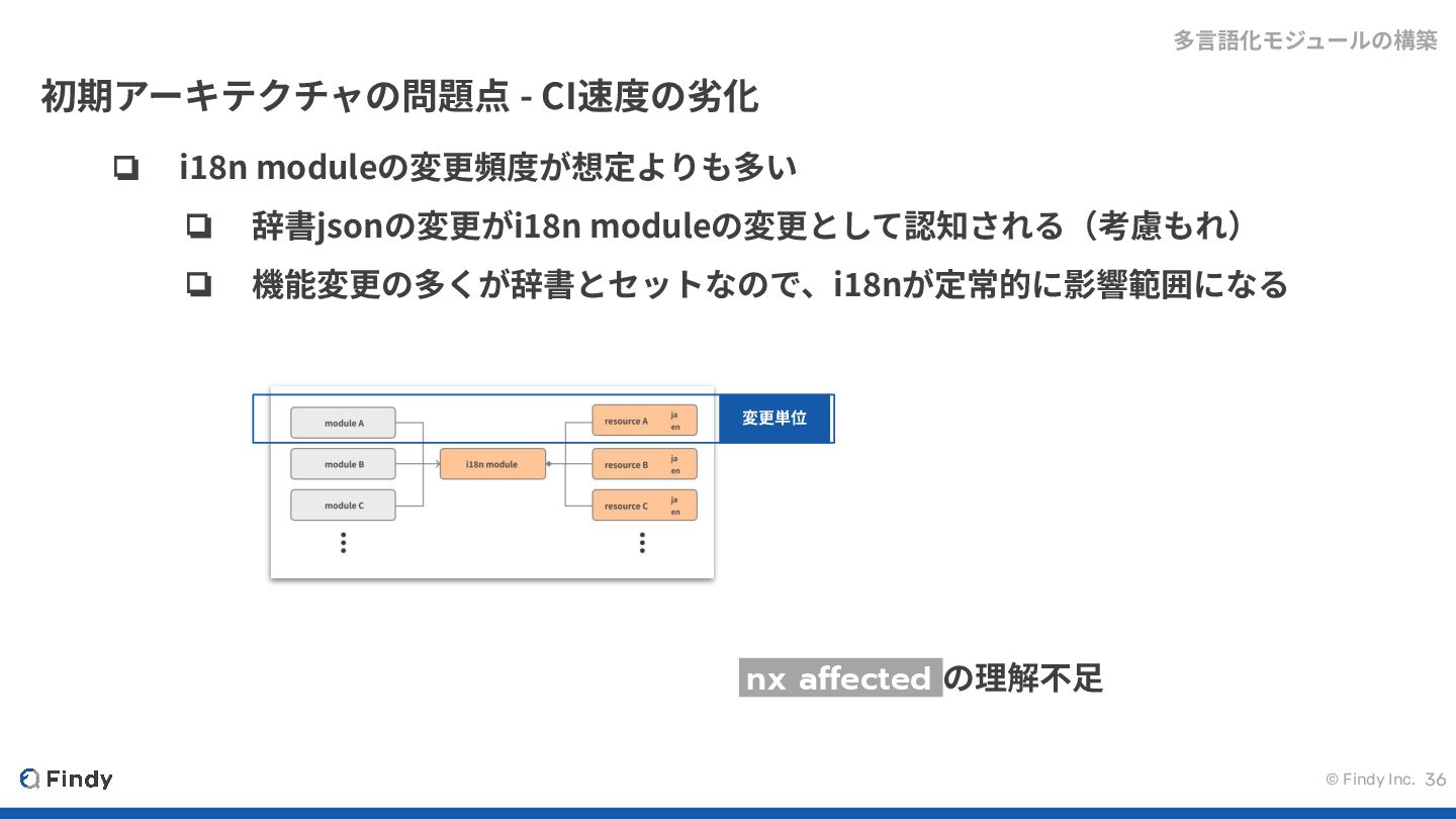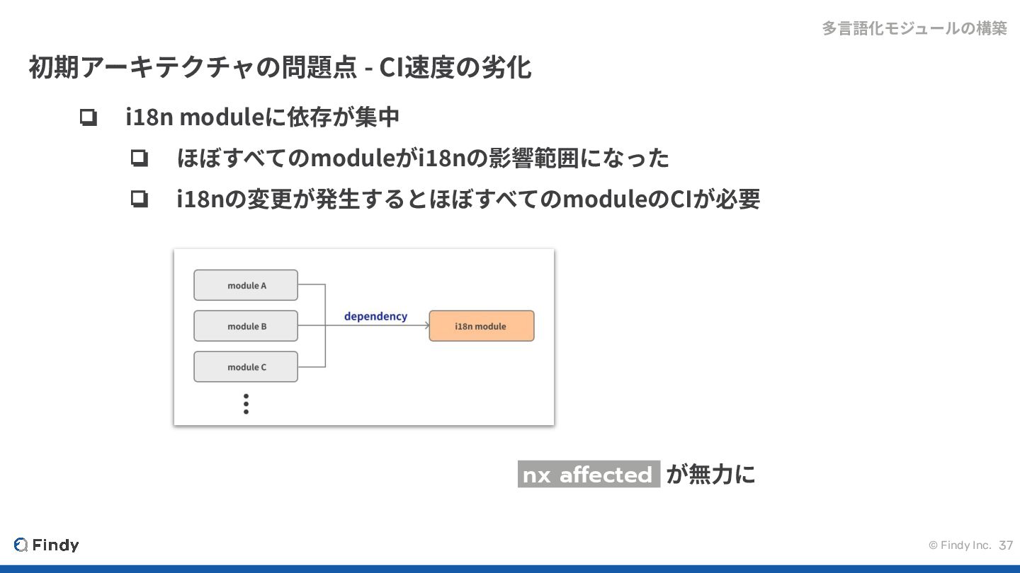 © Findy Inc. 36 初期アーキテクチャの問題点 - CI速度の劣化 多⾔語化モジュールの構築 ❏ i18n