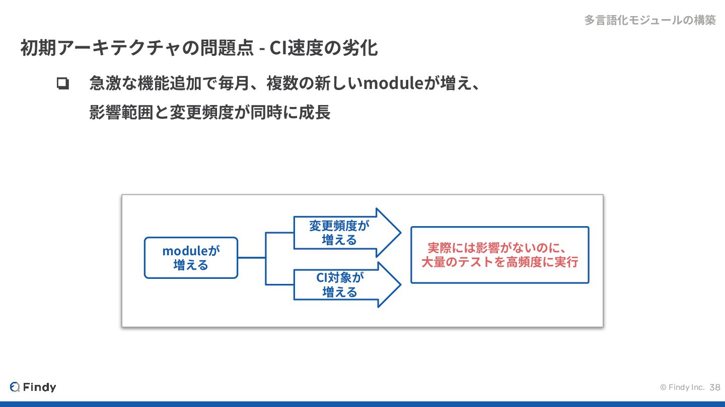 © Findy Inc. 37 初期アーキテクチャの問題点 - CI速度の劣化 多⾔語化モジュールの構築 ❏ i18n