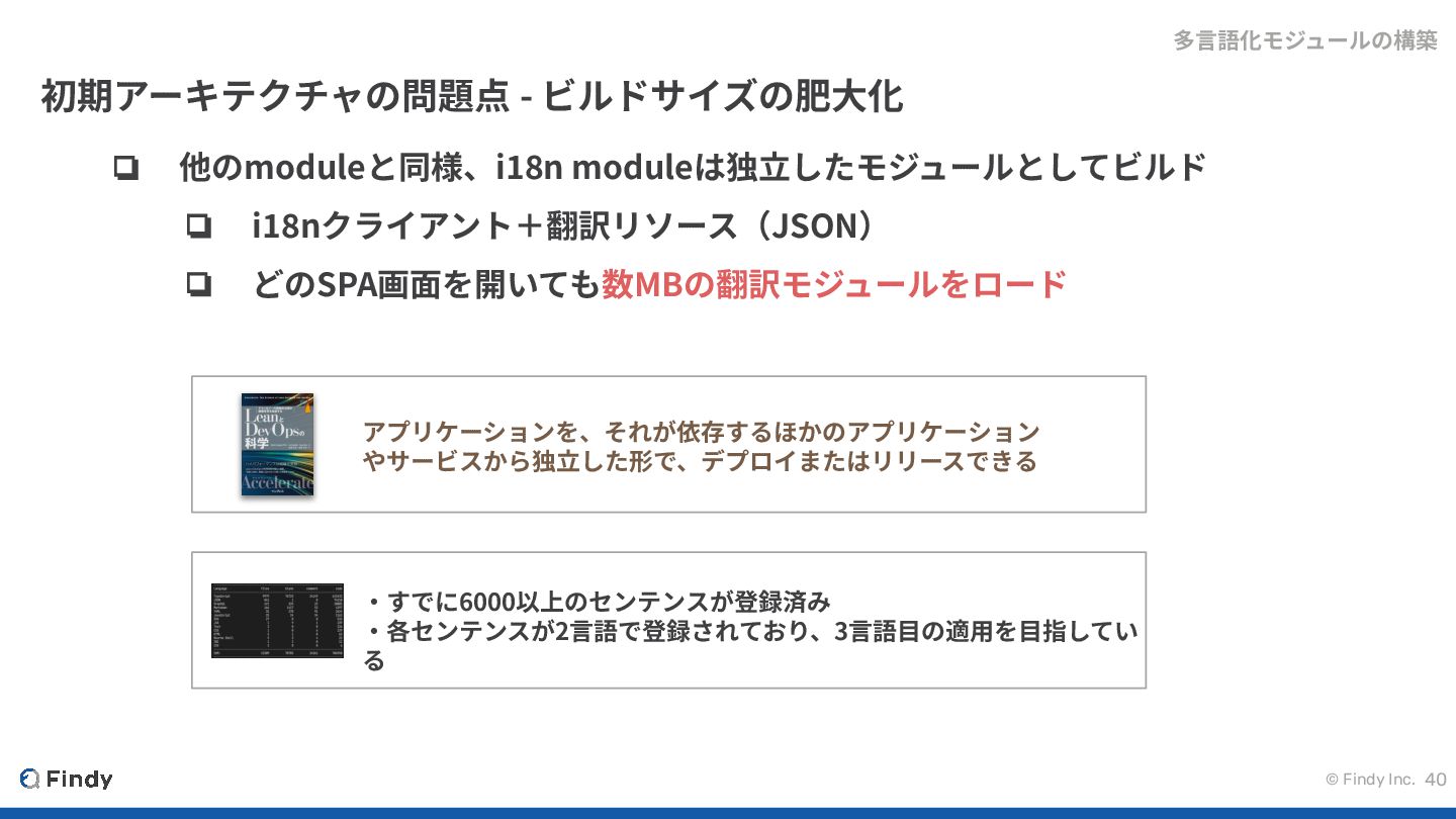© Findy Inc. 40 初期アーキテクチャの問題点 - ビルドサイズの肥⼤化 多⾔語化モジュールの構築 ❏ 他のmoduleと同様、i18n