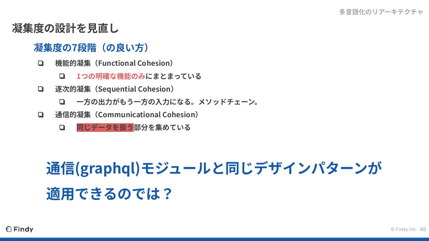 逐次的凝集(Sequential Cohesion) ❏ ⼀⽅の出⼒がもう⼀⽅の⼊⼒になる。メソッドチェーン。 ❏ 通信的凝集(Communicational Cohesion) ❏ 同じデータを扱う部分を集めている 44 凝集度の設計を⾒直し 多⾔語化のリアーキテクチャ