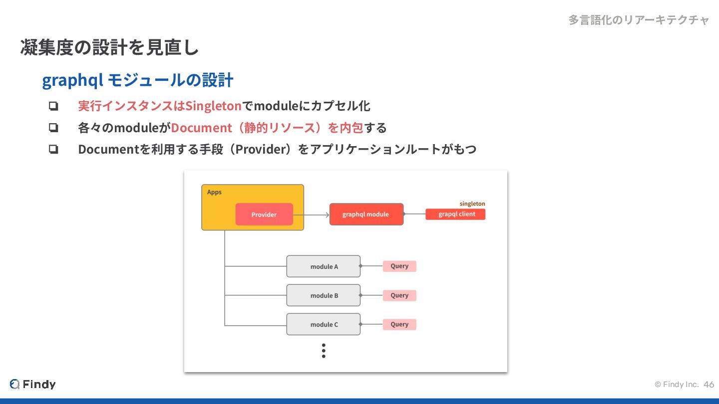 © Findy Inc. graphql モジュールの設計 ❏ 実⾏インスタンスはSingletonでmoduleにカプセル化 ❏ 各々のmoduleがDocument(静的リソース)を内包する ❏