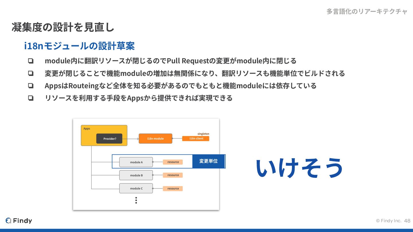 © Findy Inc. i18nモジュールの設計草案 ❏ module内に翻訳リソースが閉じるのでPull Requestの変更がmodule内に閉じる ❏ 変更が閉じることで機能moduleの増加は無関係になり、翻訳リソースも機能単位でビルドされる ❏