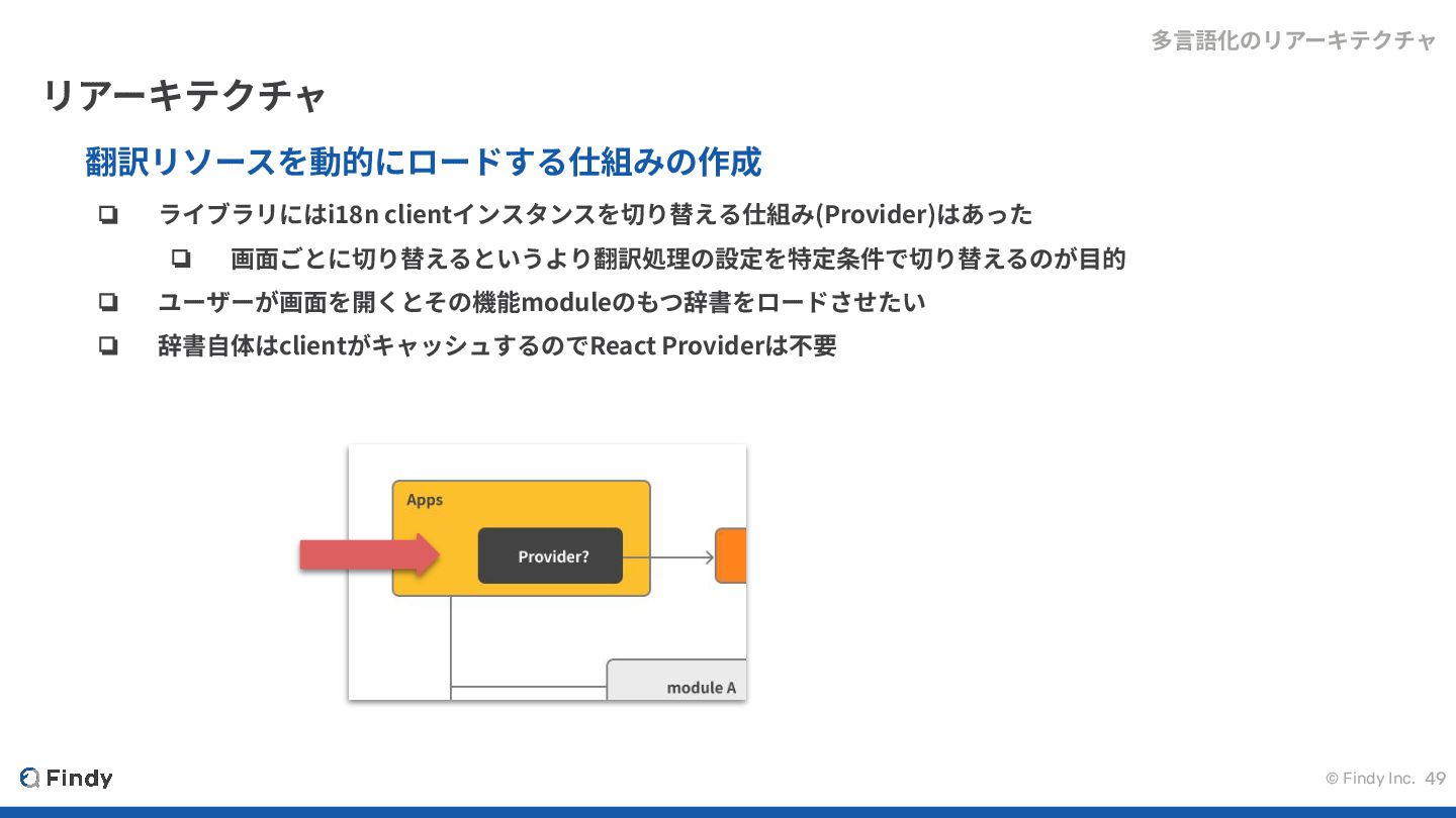 ユーザーが画⾯を開くとその機能moduleのもつ辞書をロードさせたい ❏ 辞書⾃体はclientがキャッシュするのでReact Providerは不要 49 リアーキテクチャ 多⾔語化のリアーキテクチャ