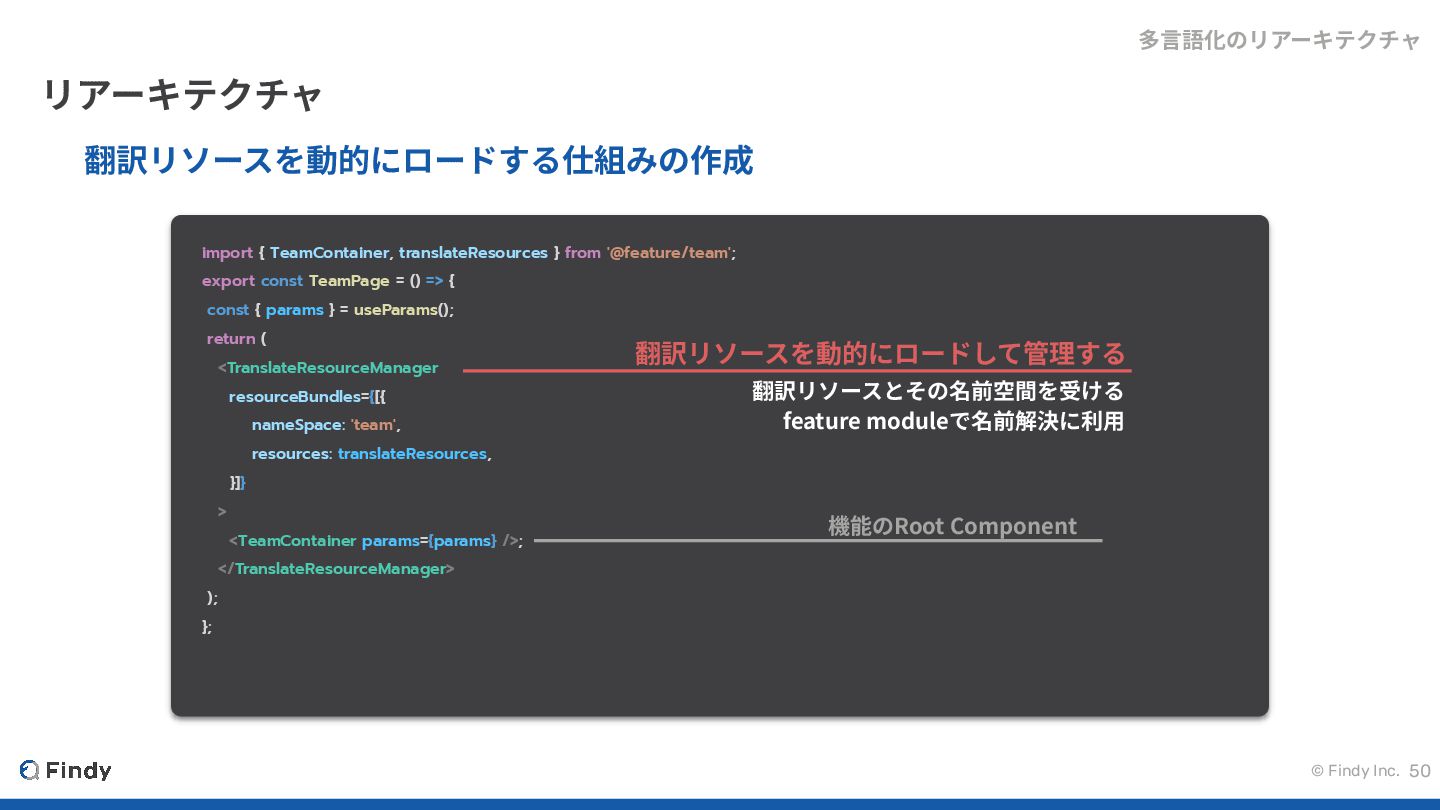 © Findy Inc. 翻訳リソースを動的にロードする仕組みの作成 50 リアーキテクチャ 多⾔語化のリアーキテクチャ import { TeamContainer,