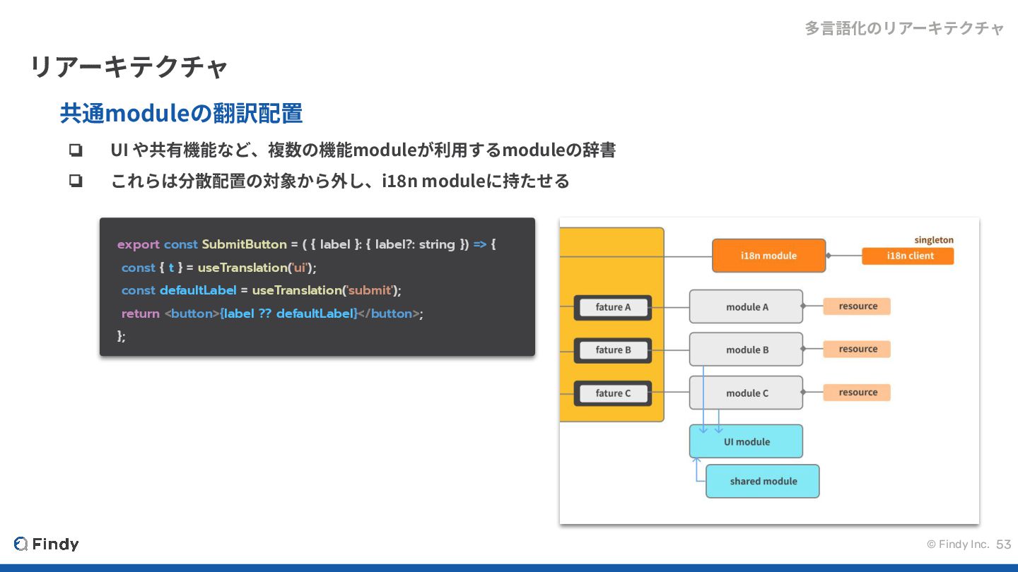 53 リアーキテクチャ 多⾔語化のリアーキテクチャ export const SubmitButton = ( { label }: { label?: string }) => { const { t } = useTranslation('ui'); const defaultLabel = useTranslation('submit'); return <button>{label ?? defaultLabel}</button>; };