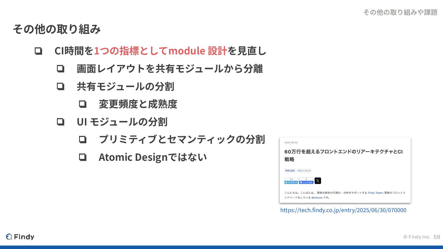 ❏ 変更頻度と成熟度 ❏ UI モジュールの分割 ❏ プリミティブとセマンティックの分割 ❏ Atomic Designではない 58 その他の取り組み その他の取り組みや課題 https://tech.findy.co.jp/entry/2025/06/30/070000