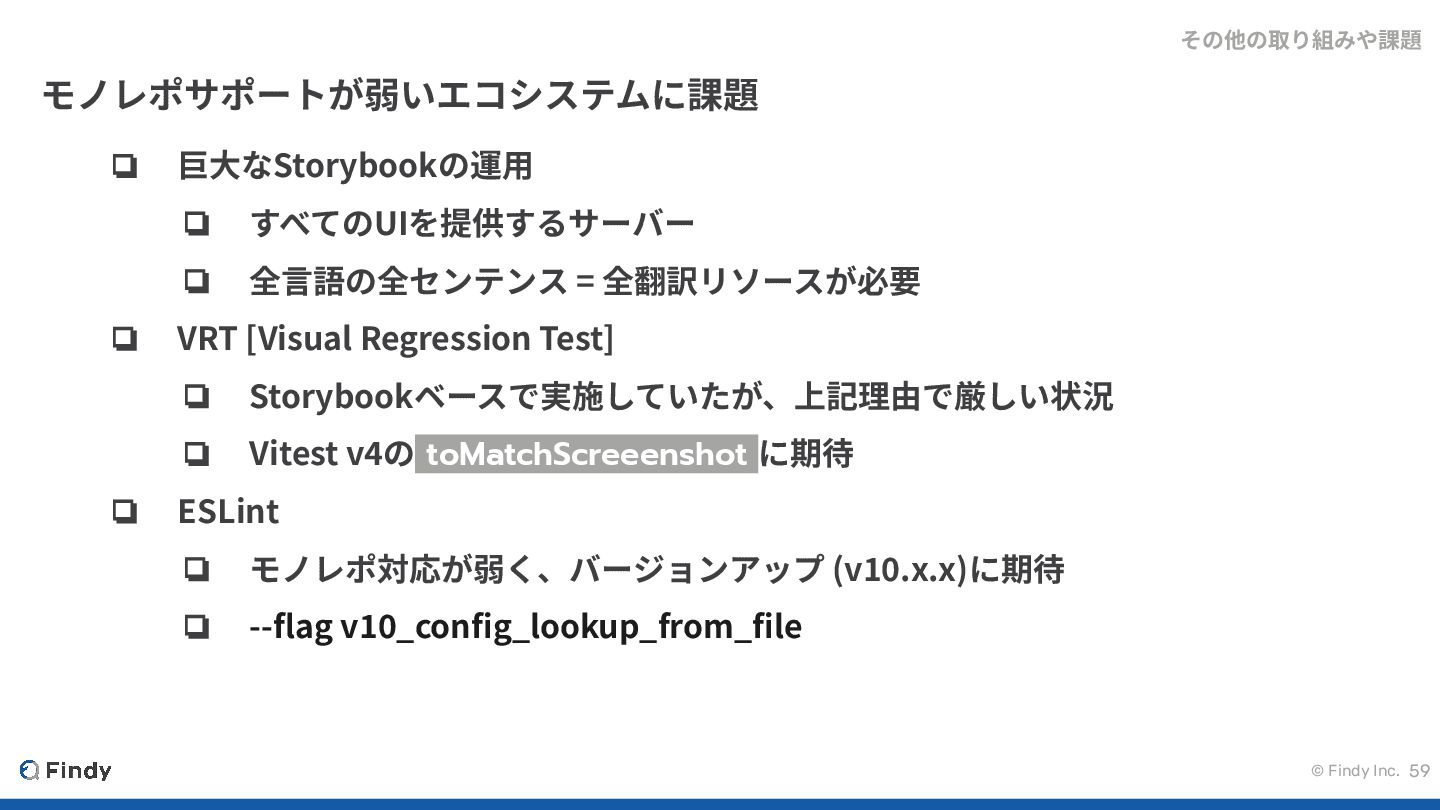 全翻訳リソースが必要 ❏ VRT [Visual Regression Test] ❏ Storybookベースで実施していたが、上記理由で厳しい状況 ❏ Vitest v4の toMatchScreeenshot に期待 ❏ ESLint ❏ モノレポ対応が弱く、バージョンアップ (v10.x.x)に期待 ❏ --flag v10_config_lookup_from_file モノレポサポートが弱いエコシステムに課題 59 その他の取り組みや課題