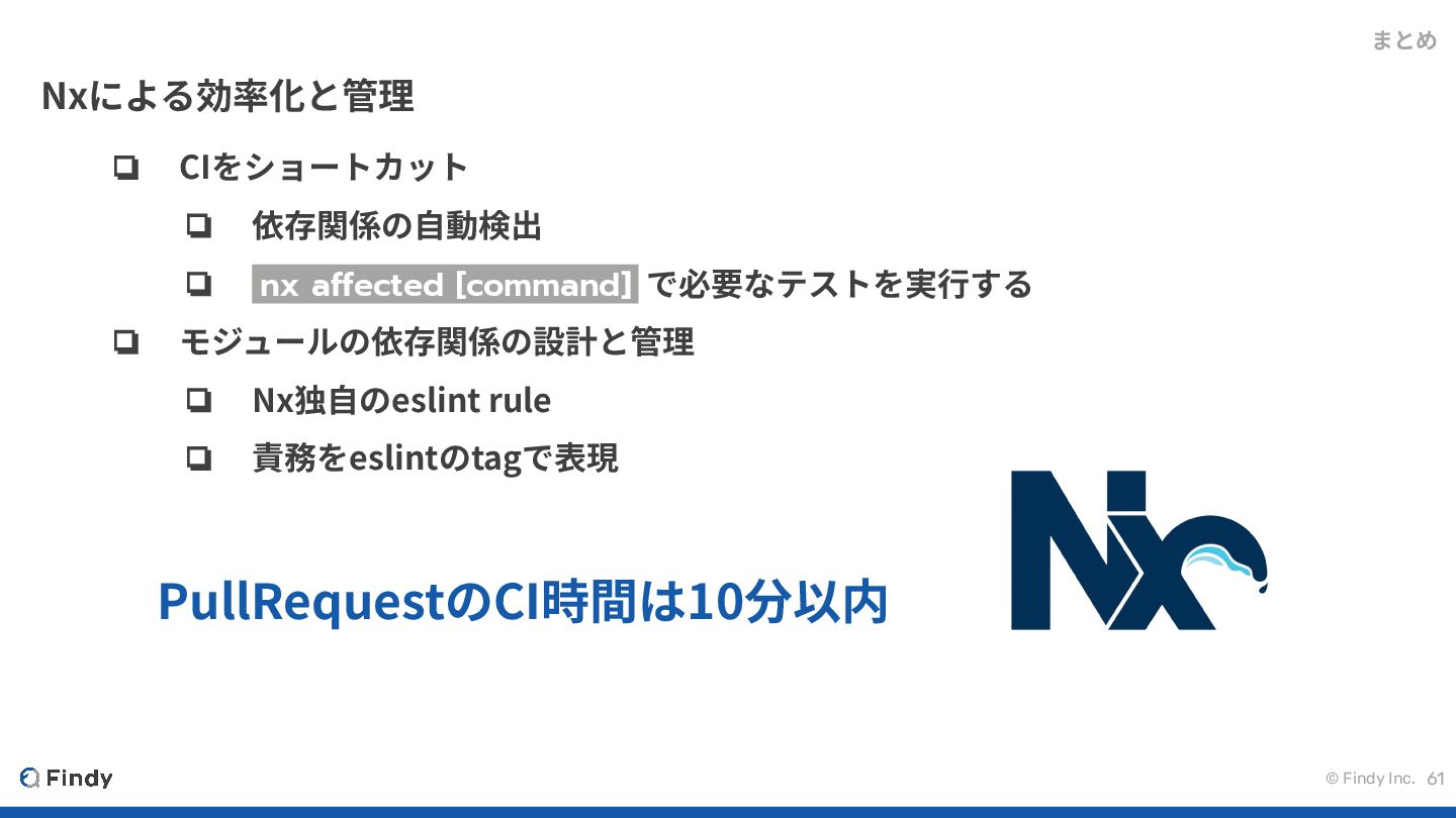 [command] で必要なテストを実⾏する ❏ モジュールの依存関係の設計と管理 ❏ Nx独⾃のeslint rule ❏ 責務をeslintのtagで表現 Nxによる効率化と管理 61 まとめ PullRequestのCI時間は10分以内