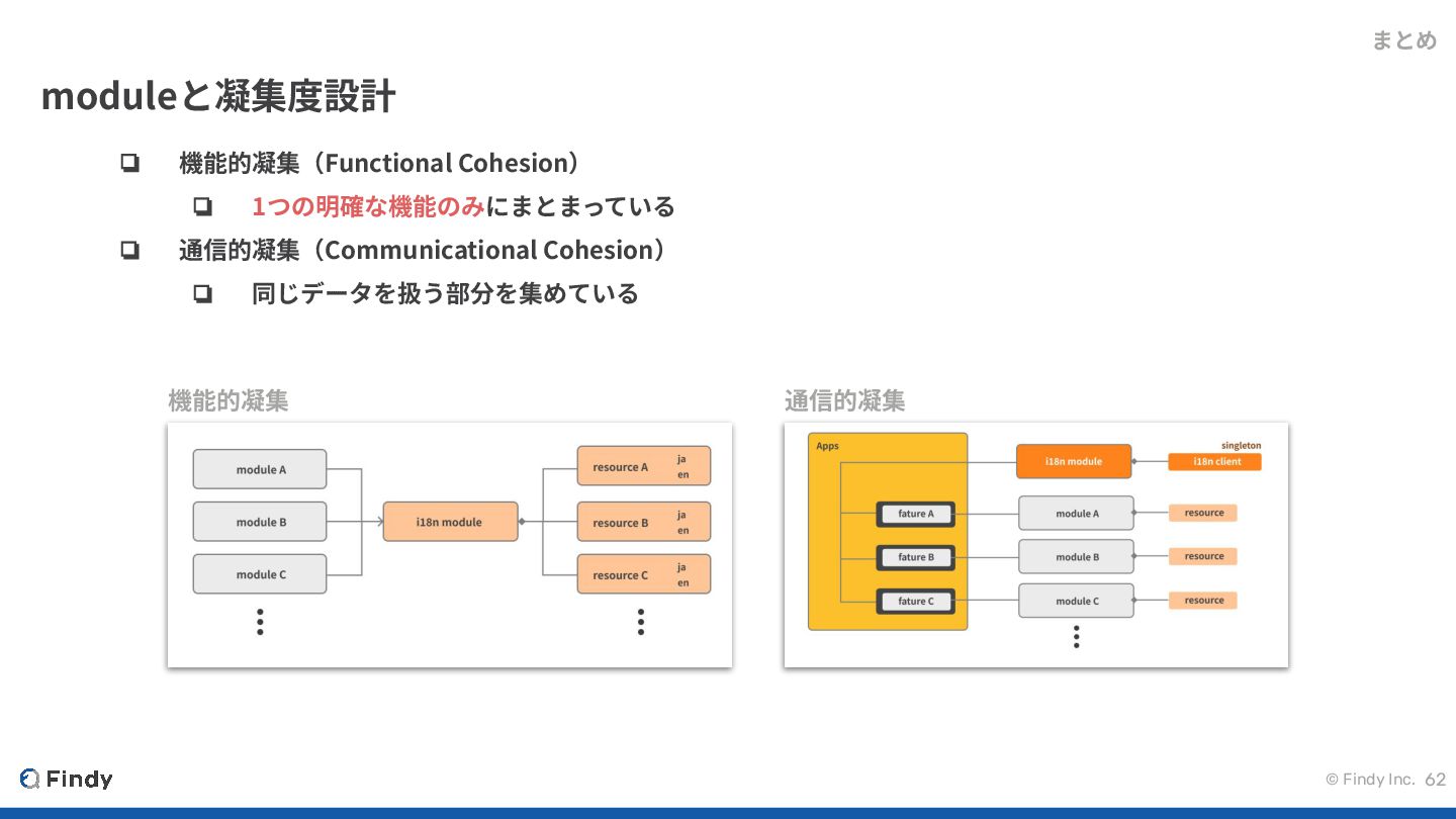 © Findy Inc. moduleと凝集度設計 62 まとめ ❏ 機能的凝集(Functional Cohesion) ❏