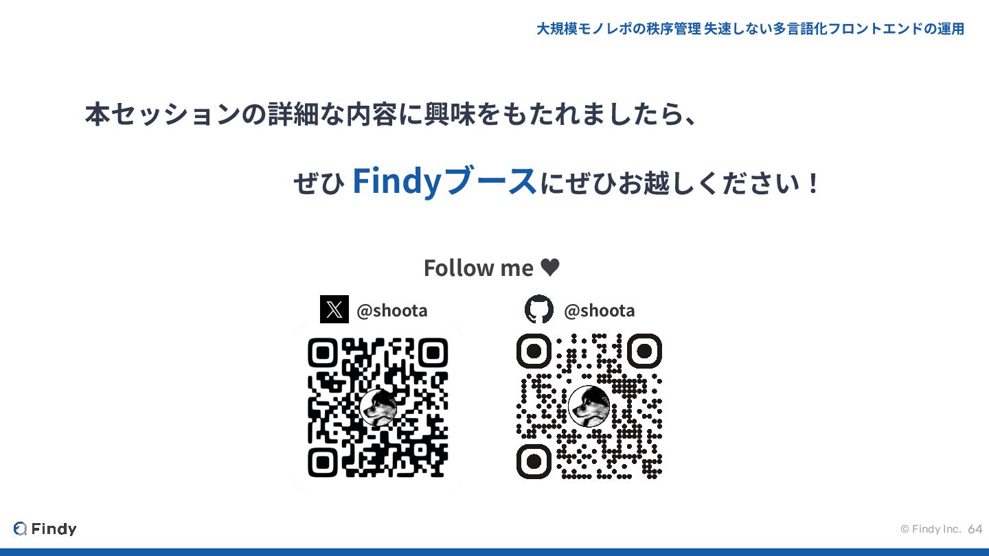© Findy Inc. 本セッションの詳細な内容に興味をもたれましたら、 ぜひ Findyブースにぜひお越しください! 64 @shoota @shoota Follow