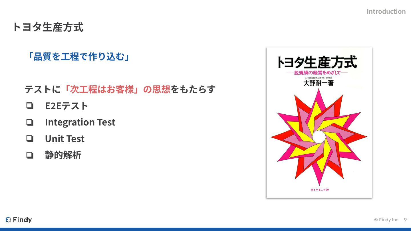 © Findy Inc. 9 Introduction トヨタ⽣産⽅式 「品質を⼯程で作り込む」 テストに「次⼯程はお客様」の思想をもたらす ❏ E2Eテスト