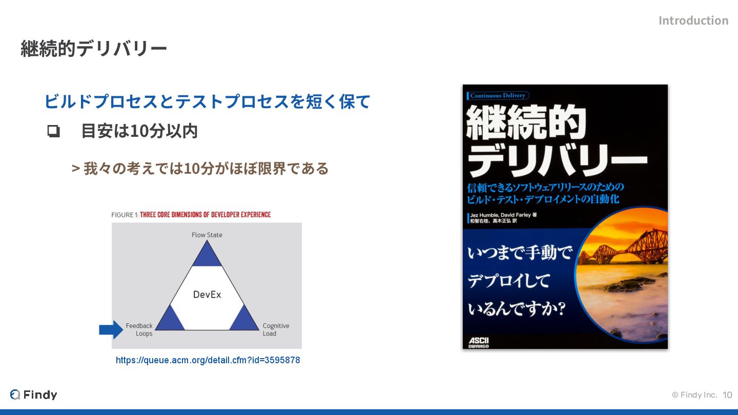© Findy Inc. https://queue.acm.org/detail.cfm?id=3595878 10 Introduction 継続的デリバリー ビルドプロセスとテストプロセスを短く保て ❏ ⽬安は10分以内