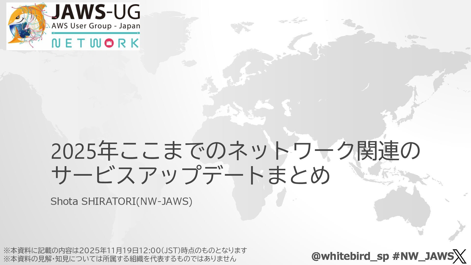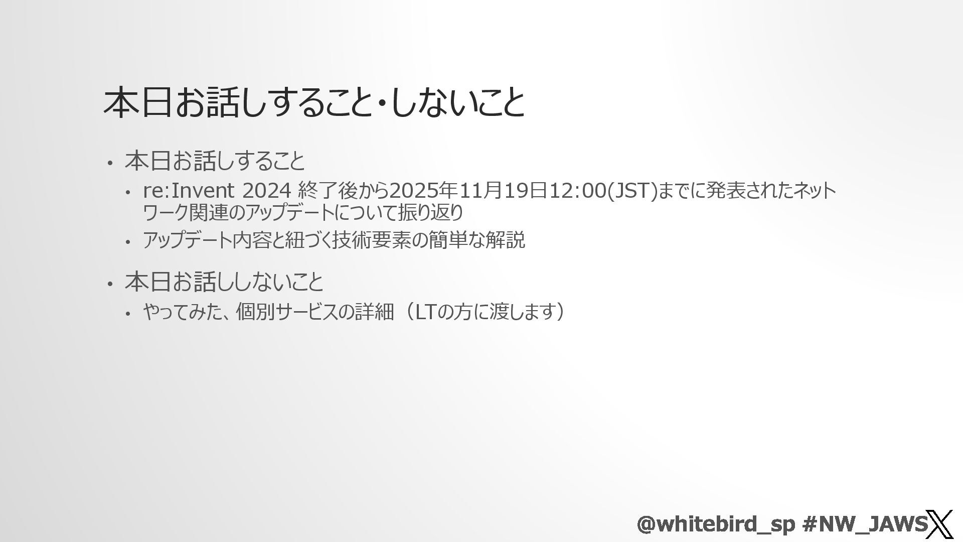 2. 今回のセッションで取り上げる対象の整理 @whitebird_sp #NW_JAWS • AWS 最新情報に記載のもの • 対象期間:2024年12月7日~2025年11月19日12:00(JST) • 対象カテゴリ・ワード: