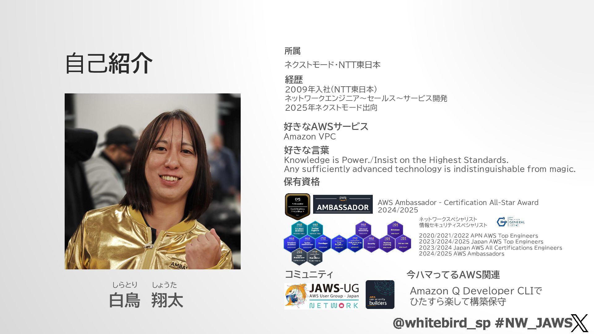 しらとり しょうた 好きなAWSサービス Amazon VPC ネットワークスペシャリスト 情報セキュリティスペシャリスト 2020/2021/2022 APN AWS Top Engineers 2023/2024/2025 Japan AWS Top Engineers 2023/2024 Japan AWS All Certifications Engineers 2024/2025 AWS Ambassadors 好きな言葉 Knowledge is Power./Insist on the Highest Standards. Any sufficiently advanced technology is indistinguishable from magic. コミュニティ AWS Ambassador - Certification All-Star Award 2024/2025 今ハマってるAWS関連 Amazon Q Developer CLIで ひたすら楽して構築保守 @whitebird_sp #NW_JAWS