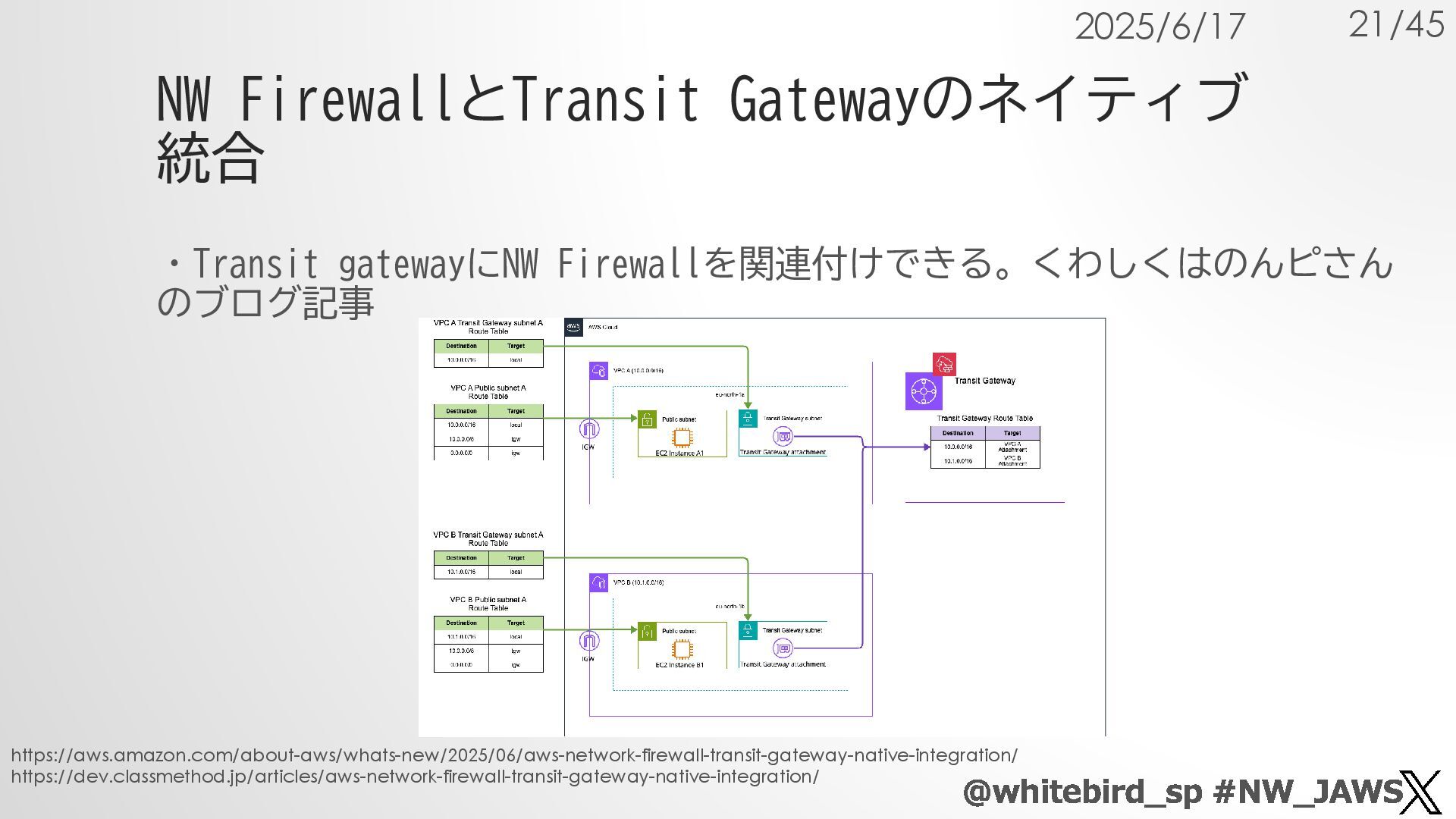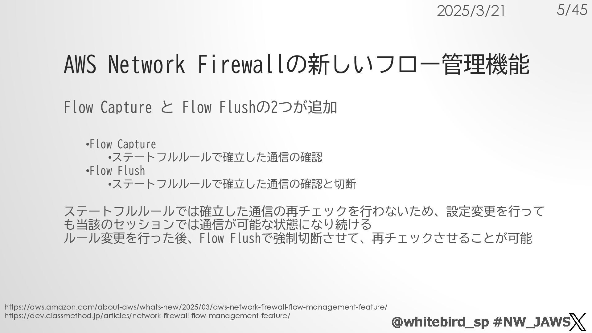 7. AWS Network Firewallの新しいフロー管理機能 @whitebird_sp #NW_JAWS 5/45 https://aws.amazon.com/about-aws/whats-new/2025/03/aws-network-firewall-flow-management-feature/ https://dev.classmethod.jp/articles/network-firewall-flow-management-feature/ 2025/3/21 Flow