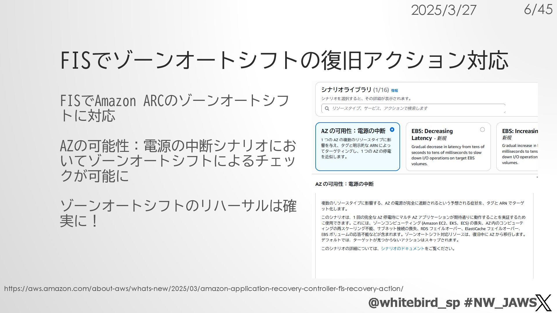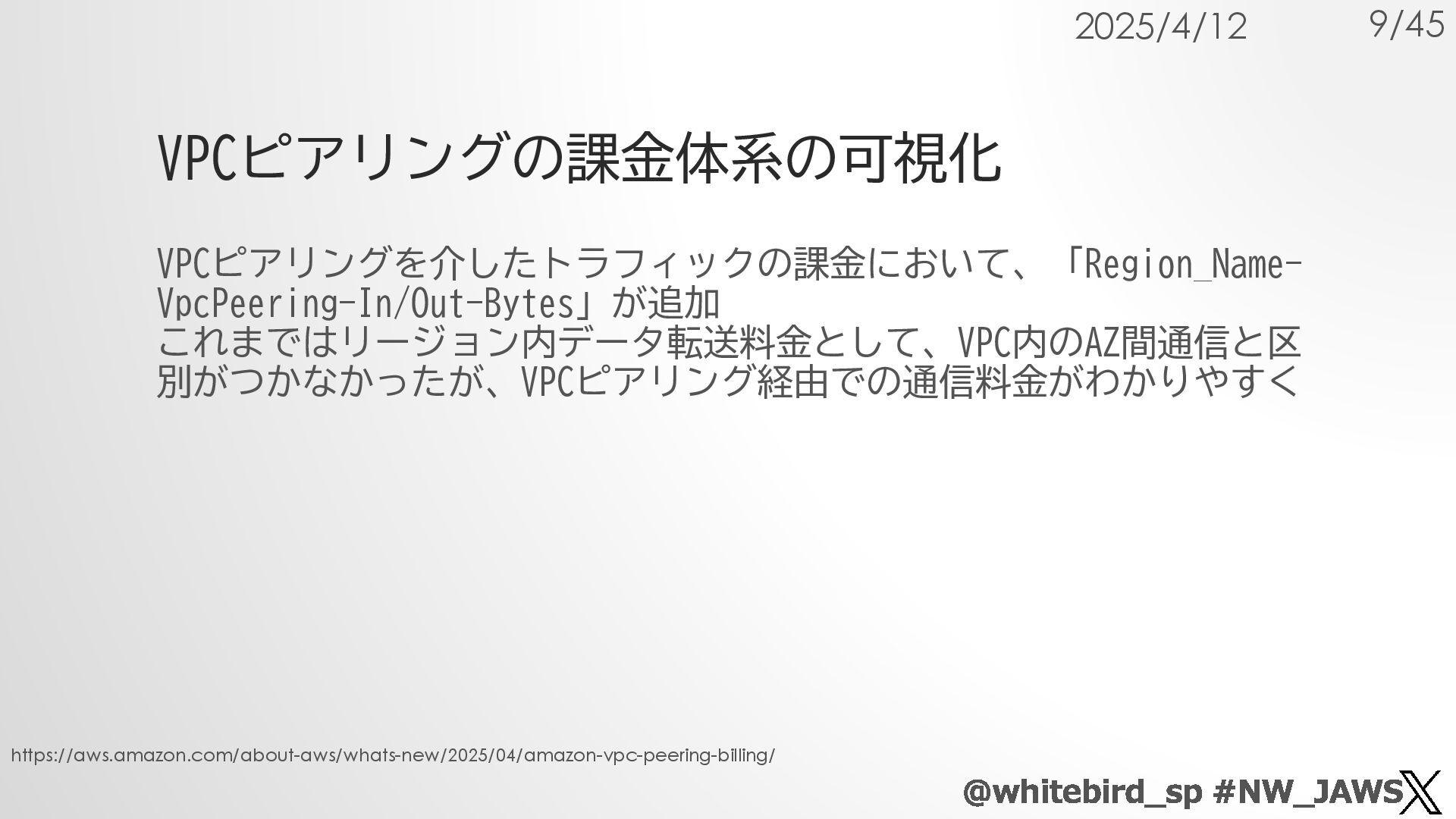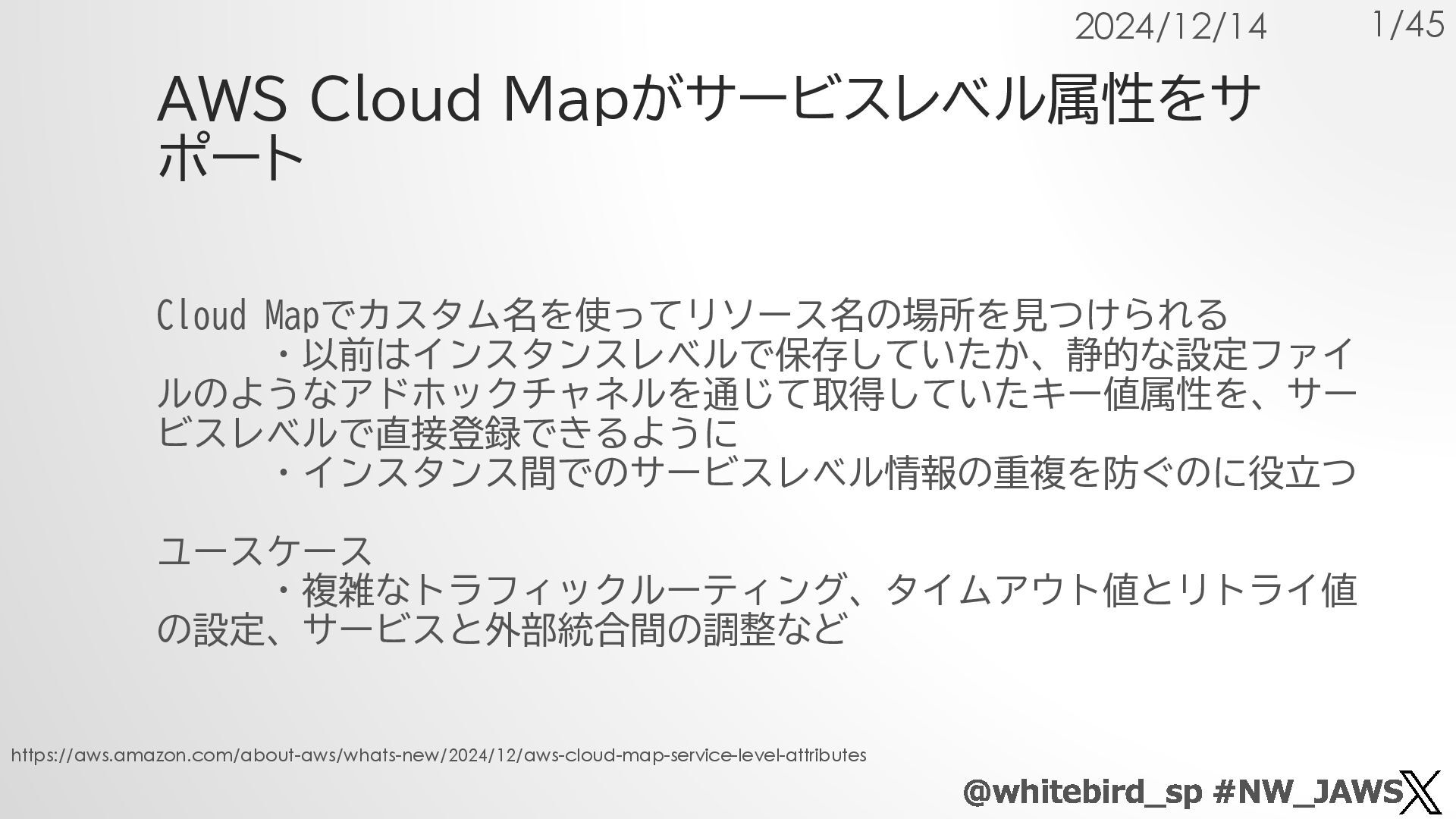 3. AWS Cloud Mapがサービスレベル属性をサ ポート @whitebird_sp #NW_JAWS 1/45 https://aws.amazon.com/about-aws/whats-new/2024/12/aws-cloud-map-service-level-attributes 2024/12/14 Cloud