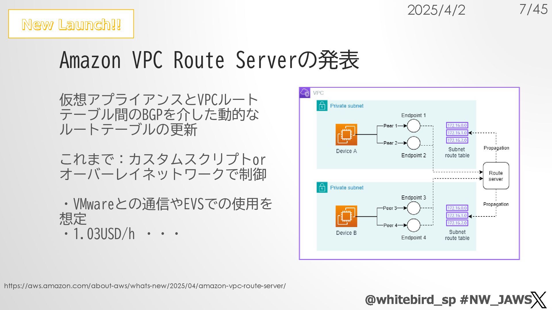8. Amazon VPC Route Serverの発表 @whitebird_sp #NW_JAWS 7/45 https://aws.amazon.com/about-aws/whats-new/2025/04/amazon-vpc-route-server/ New Launch!!