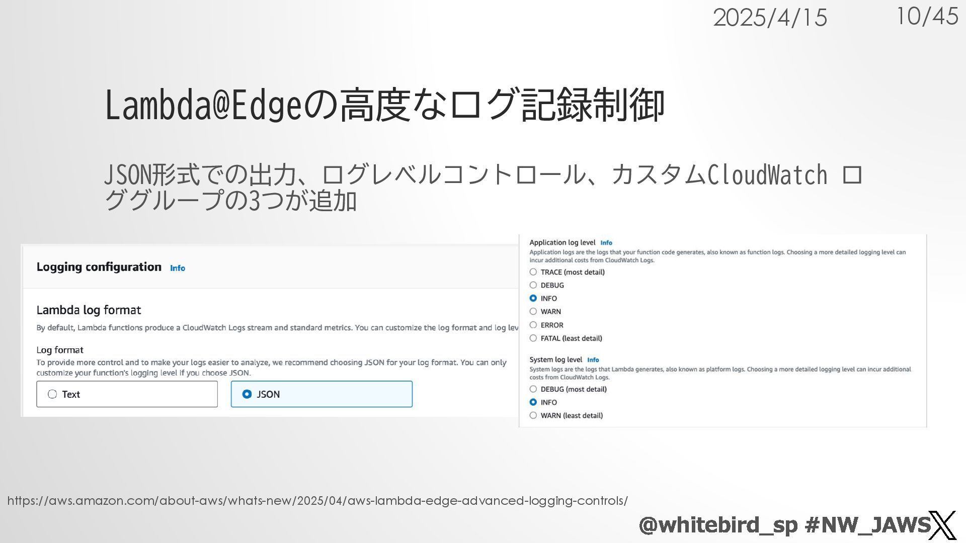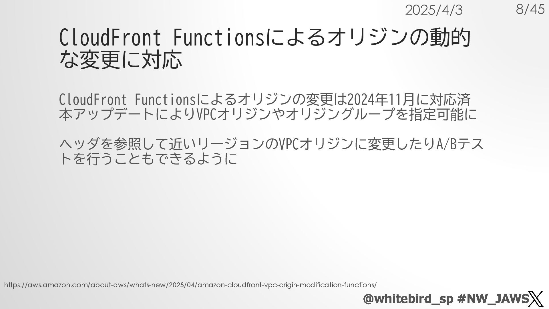 9. CloudFront Functionsによるオリジンの動的 な変更に対応 @whitebird_sp #NW_JAWS 8/45 https://aws.amazon.com/about-aws/whats-new/2025/04/amazon-cloudfront-vpc-origin-modification-functions/ 2025/4/3 CloudFront Functionsによるオリジンの変更は2024年11月に対応済