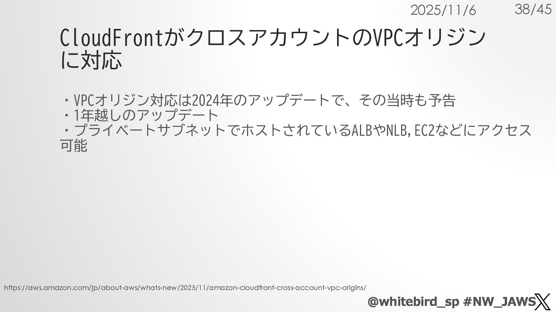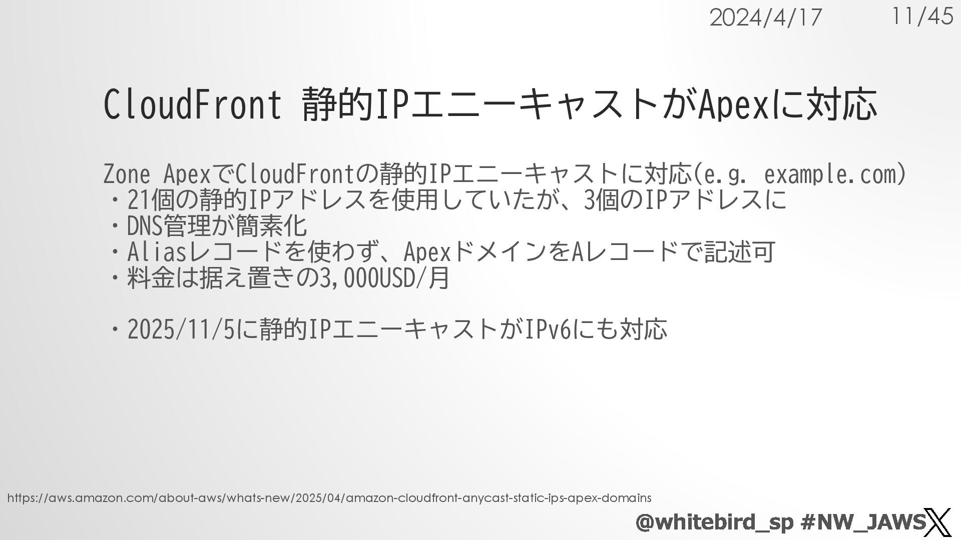 10. CloudFront 静的IPエニーキャストがApexに対応 @whitebird_sp #NW_JAWS 11/45 https://aws.amazon.com/about-aws/whats-new/2025/04/amazon-cloudfront-anycast-static-ips-apex-domains 2024/4/17 Zone ApexでCloudFrontの静的IPエニーキャストに対応(e.g. example.com)