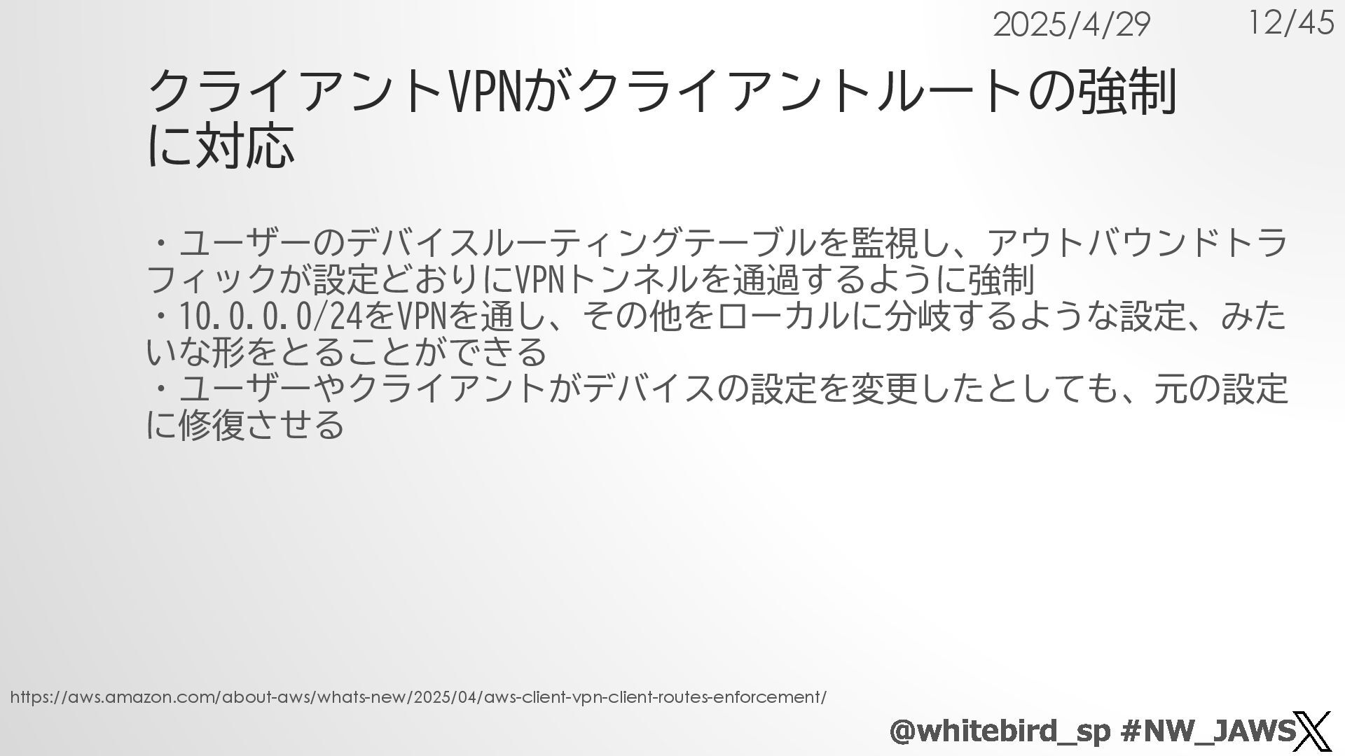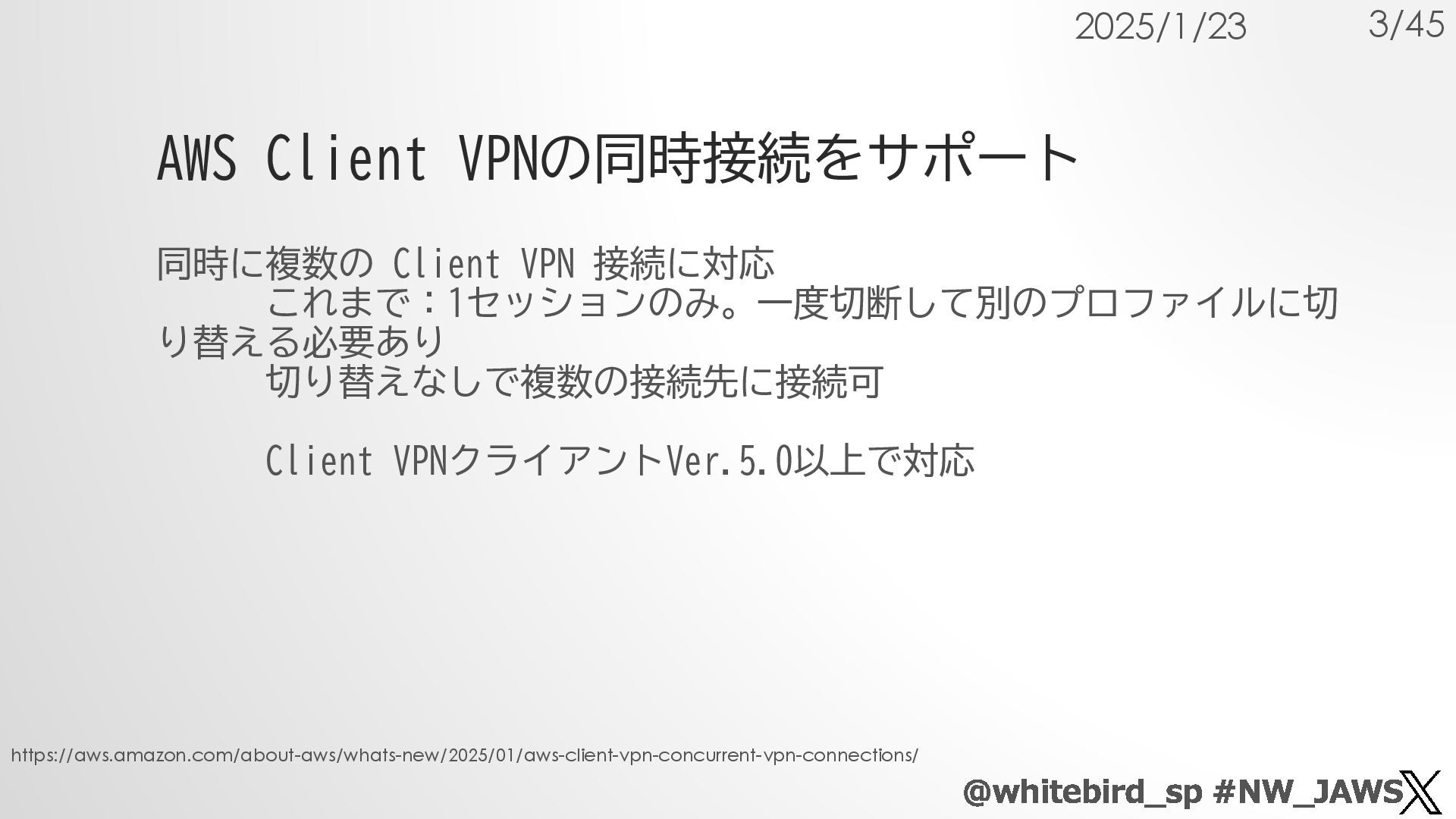5. AWS Client VPNの同時接続をサポート @whitebird_sp #NW_JAWS 3/45 https://aws.amazon.com/about-aws/whats-new/2025/01/aws-client-vpn-concurrent-vpn-connections/ 2025/1/23 同時に複数の Client