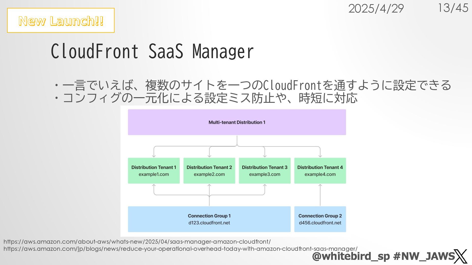 11. CloudFront SaaS Manager @whitebird_sp #NW_JAWS 13/45 https://aws.amazon.com/about-aws/whats-new/2025/04/saas-manager-amazon-cloudfront/ https://aws.amazon.com/jp/blogs/news/reduce-your-operational-overhead-today-with-amazon-cloudfront-saas-manager/ New Launch!!