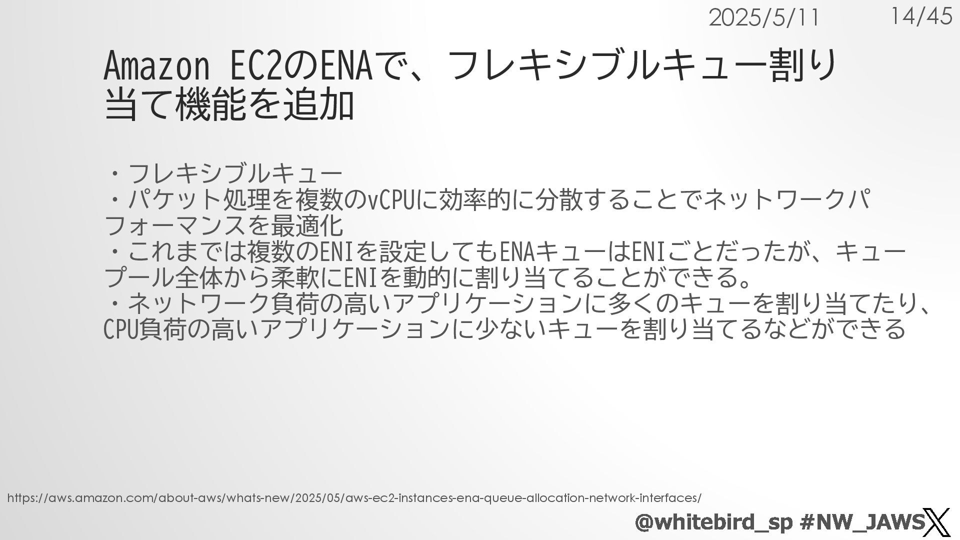 12. Amazon EC2のENAで、フレキシブルキュー割り 当て機能を追加 @whitebird_sp #NW_JAWS 14/45 https://aws.amazon.com/about-aws/whats-new/2025/05/aws-ec2-instances-ena-queue-allocation-network-interfaces/ 2025/5/11 ・フレキシブルキュー ・パケット処理を複数のvCPUに効率的に分散することでネットワークパ