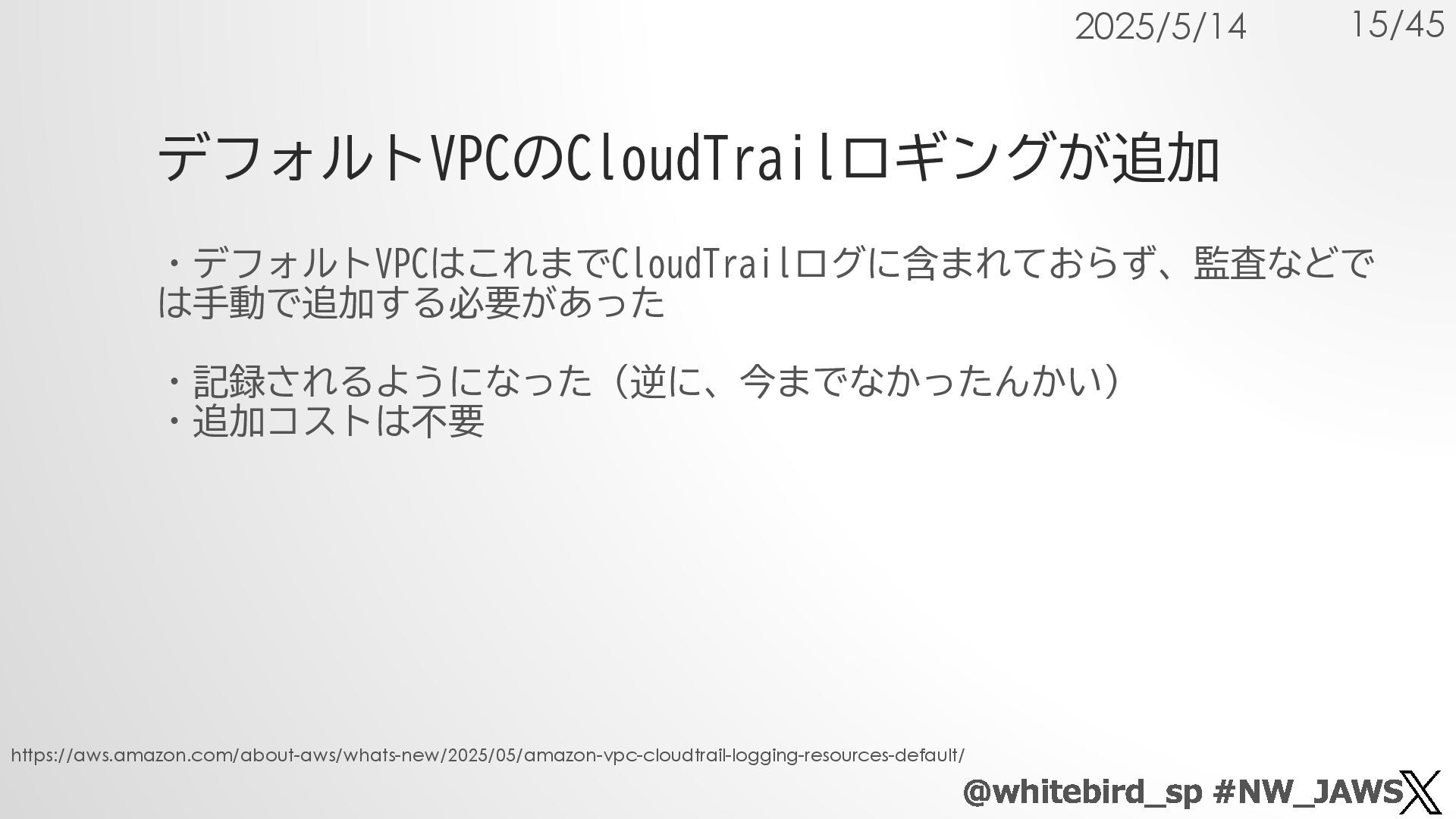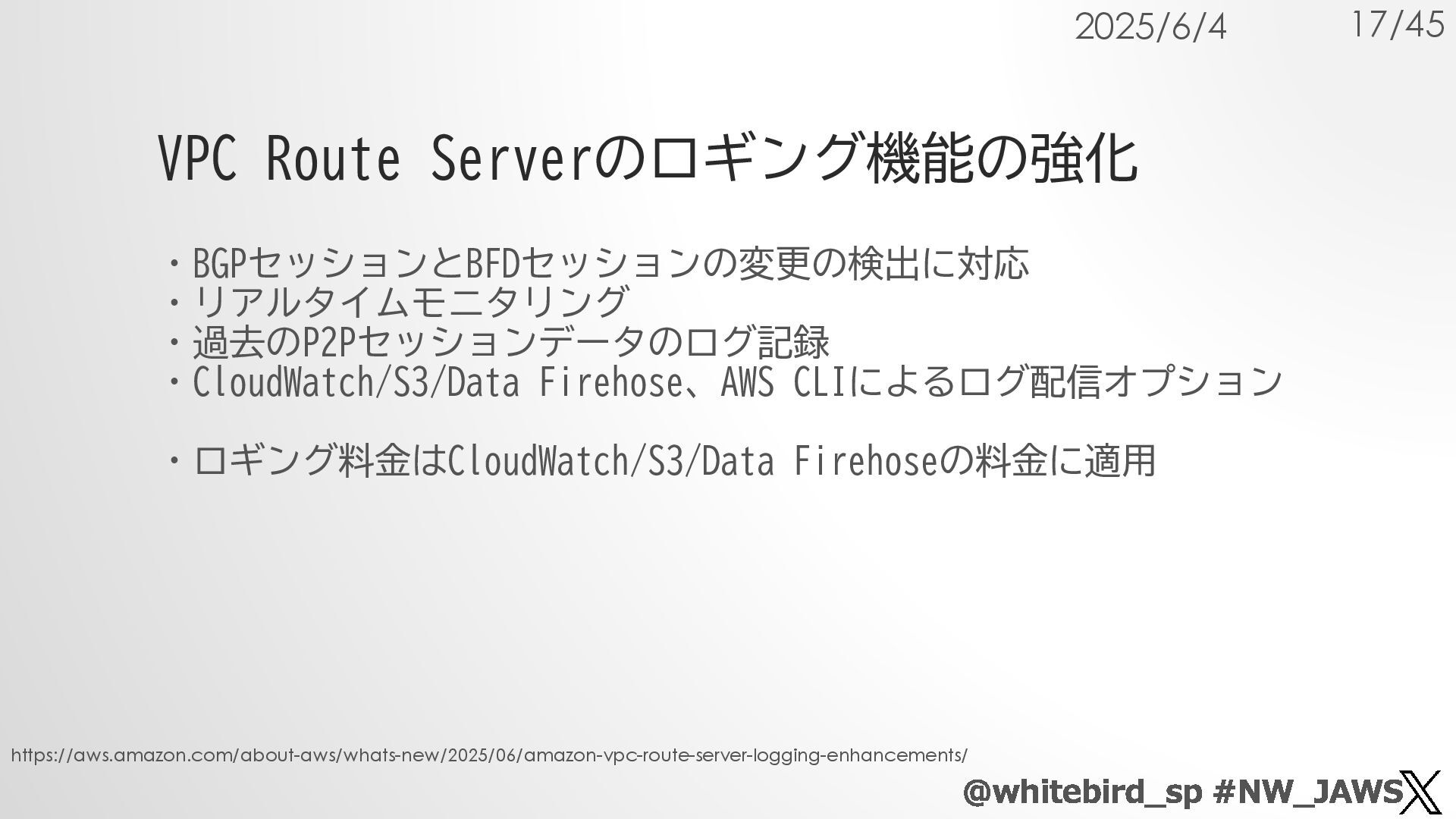 14. VPC Route Serverのロギング機能の強化 @whitebird_sp #NW_JAWS 17/45 https://aws.amazon.com/about-aws/whats-new/2025/06/amazon-vpc-route-server-logging-enhancements/ 2025/6/4 ・BGPセッションとBFDセッションの変更の検出に対応 ・リアルタイムモニタリング