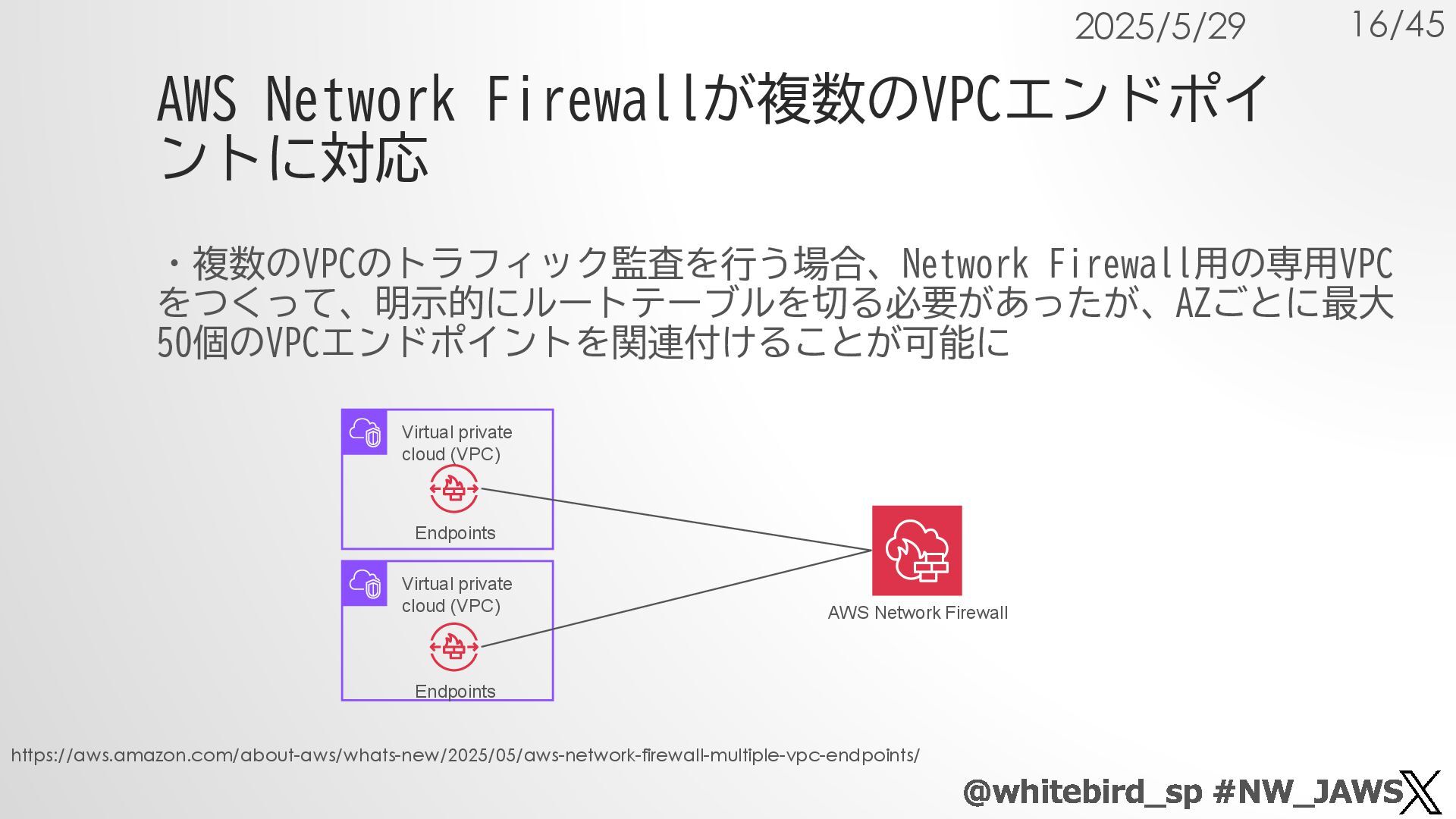 13. AWS Network Firewallが複数のVPCエンドポイ ントに対応 @whitebird_sp #NW_JAWS 16/45 https://aws.amazon.com/about-aws/whats-new/2025/05/aws-network-firewall-multiple-vpc-endpoints/ 2025/5/29 ・複数のVPCのトラフィック監査を行う場合、Network