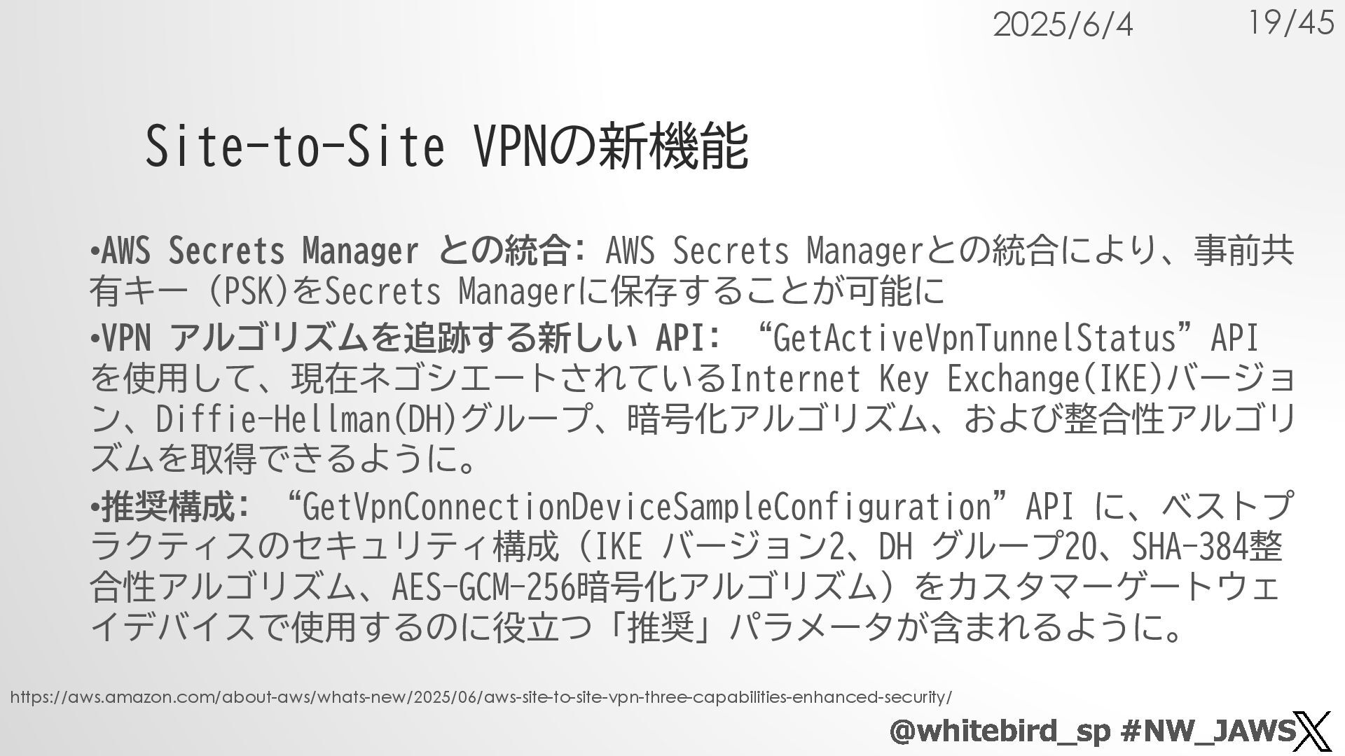 15. Site-to-Site VPNの新機能 @whitebird_sp #NW_JAWS 19/45 https://aws.amazon.com/about-aws/whats-new/2025/06/aws-site-to-site-vpn-three-capabilities-enhanced-security/ 2025/6/4 •AWS Secrets Manager