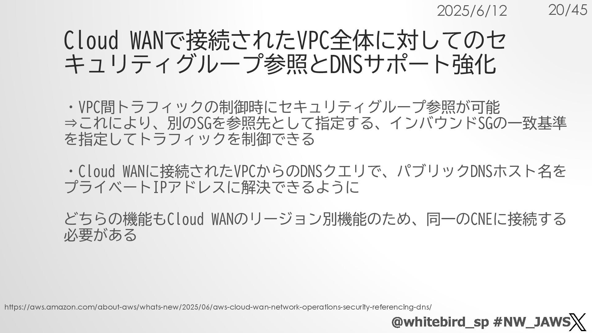 16. Cloud WANで接続されたVPC全体に対してのセ キュリティグループ参照とDNSサポート強化 @whitebird_sp #NW_JAWS 20/45 https://aws.amazon.com/about-aws/whats-new/2025/06/aws-cloud-wan-network-operations-security-referencing-dns/ 2025/6/12 ・VPC間トラフィックの制御時にセキュリティグループ参照が可能 ⇒これにより、別のSGを参照先として指定する、インバウンドSGの一致基準