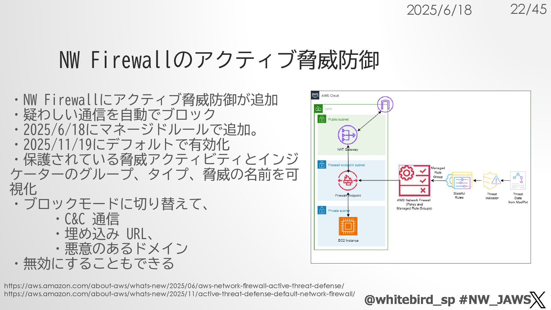 17. NW Firewallのアクティブ脅威防御 @whitebird_sp #NW_JAWS 22/45 https://aws.amazon.com/about-aws/whats-new/2025/06/aws-network-firewall-active-threat-defense/ https://aws.amazon.com/about-aws/whats-new/2025/11/active-threat-defense-default-network-firewall/ 2025/6/18 ・NW Firewallにアクティブ脅威防御が追加