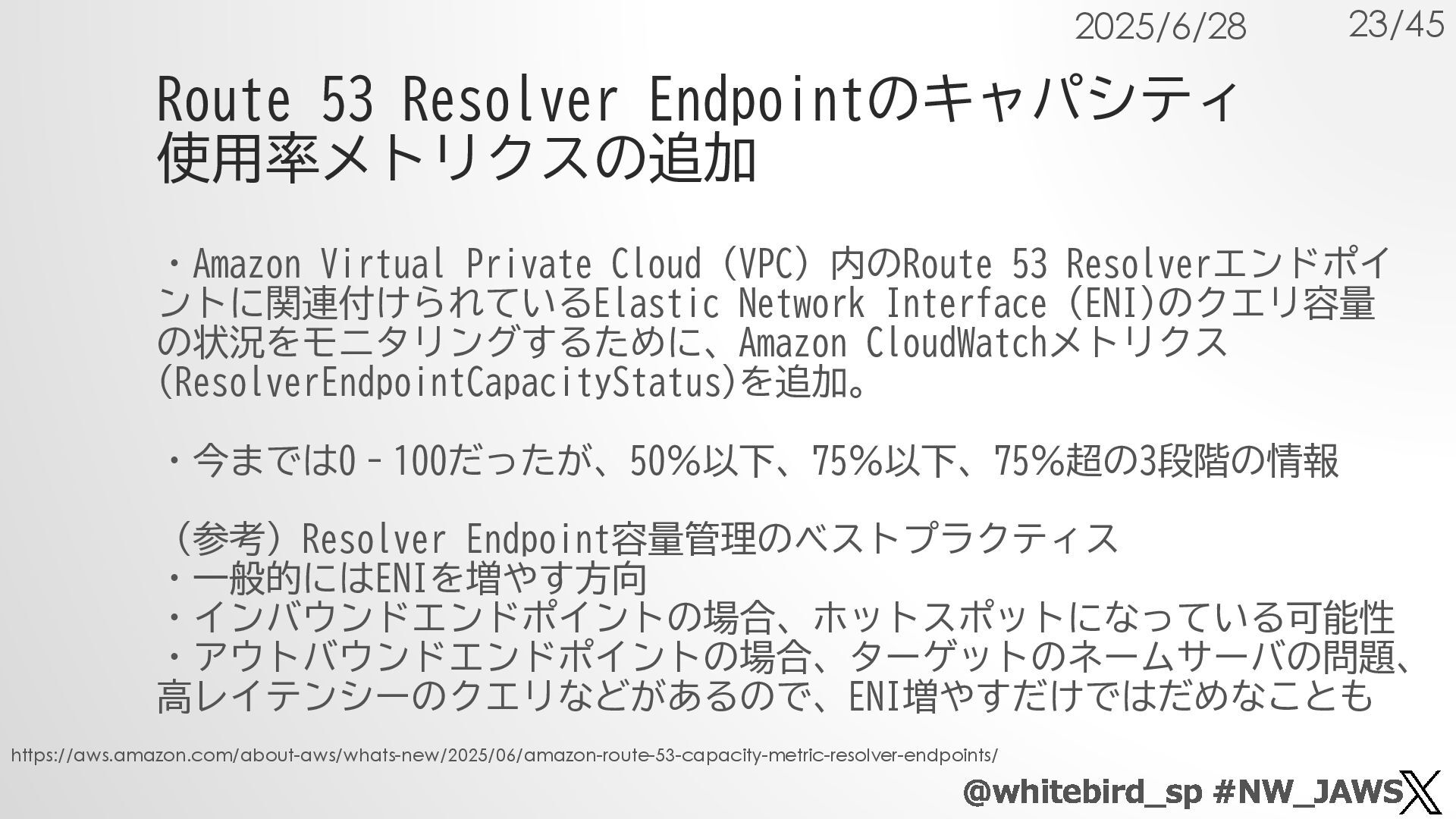 18. Route 53 Resolver Endpointのキャパシティ 使用率メトリクスの追加 @whitebird_sp #NW_JAWS 23/45 https://aws.amazon.com/about-aws/whats-new/2025/06/amazon-route-53-capacity-metric-resolver-endpoints/ 2025/6/28