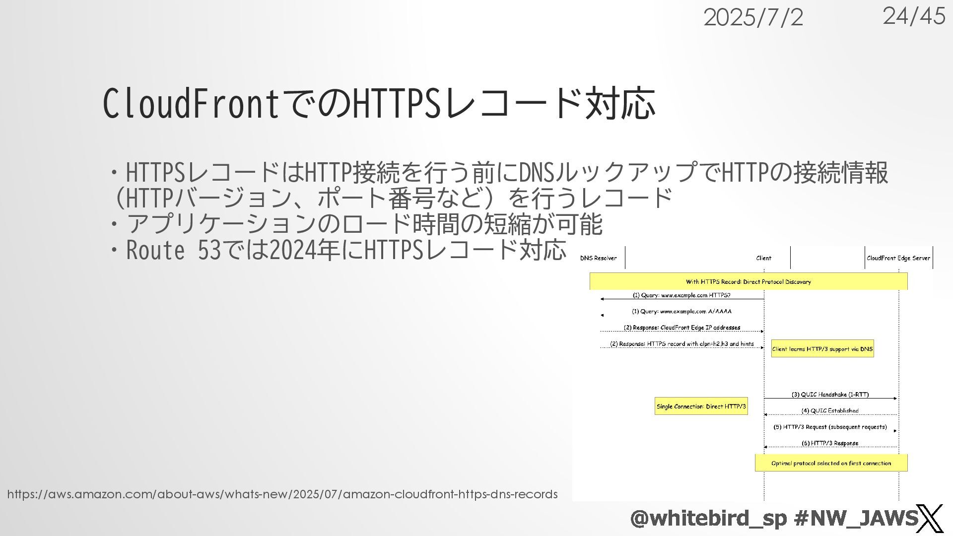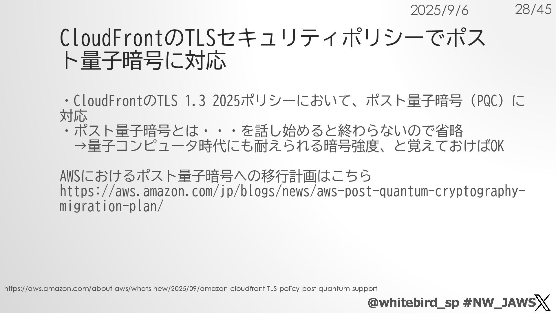 21. CloudFrontのTLSセキュリティポリシーでポス ト量子暗号に対応 @whitebird_sp #NW_JAWS 28/45 https://aws.amazon.com/about-aws/whats-new/2025/09/amazon-cloudfront-TLS-policy-post-quantum-support 2025/9/6 ・CloudFrontのTLS 1.3 2025ポリシーにおいて、ポスト量子暗号(PQC)に